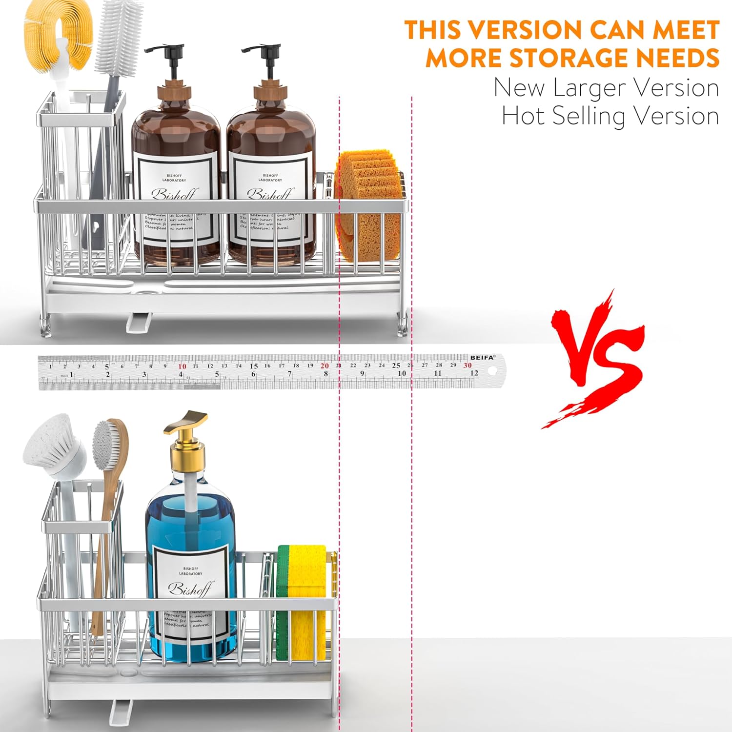 - 【LARGER CAPACITY】Cisily kitchen sink organizer is longer in length: 10.62 inch. So this sink caddy provides larger storage space and hold more cleaning accessories: dish soap dispenser x1, hand soap dispenser x1, sponge x1, some brushes.