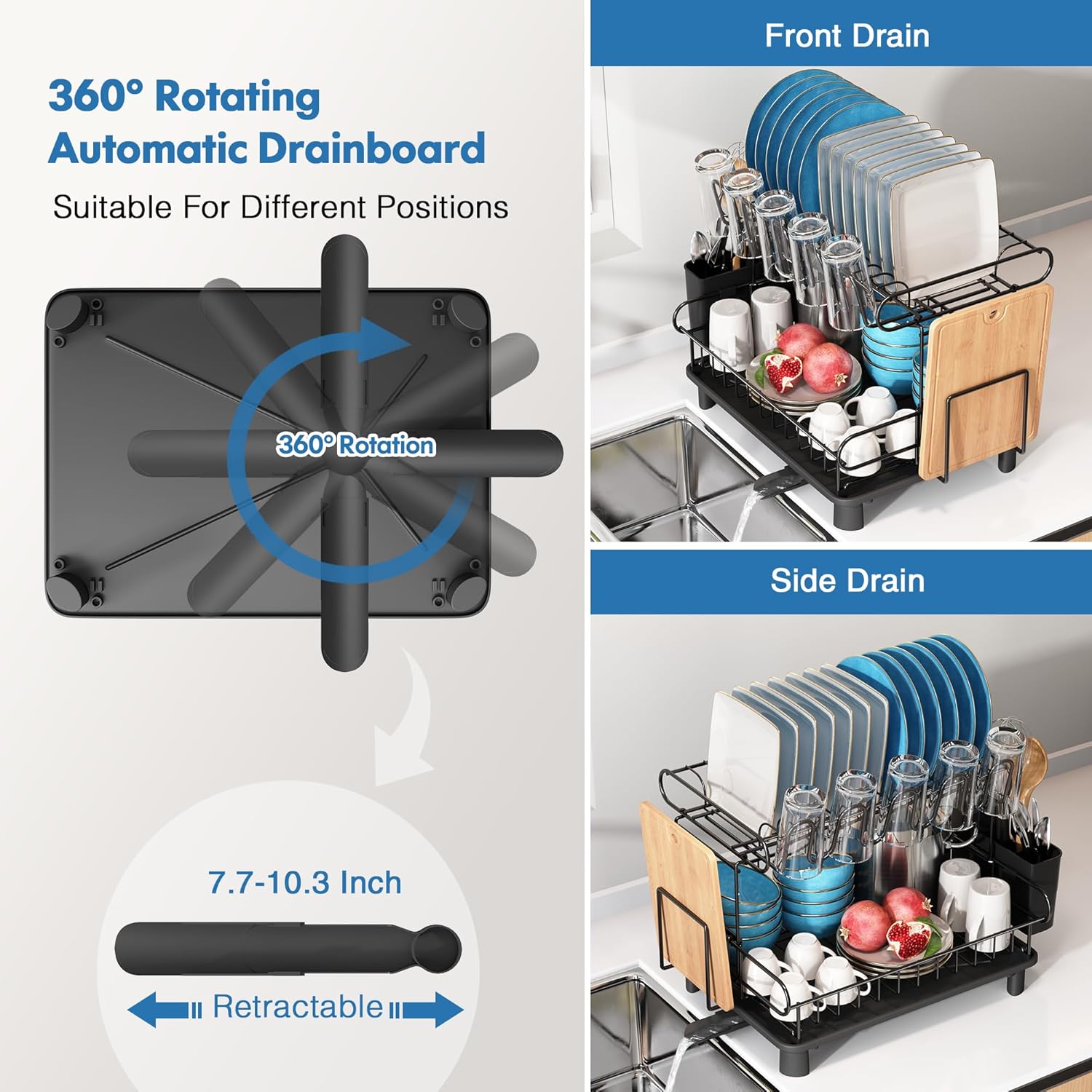 - Automatic Drainage Design: This dish strainers for kitchen counter comes with a central drain hole, ensuring that water flows directly into the sink The swivel spout can rotate 360Β°, so you can place the dish rack in the best position next to the sink as needed.