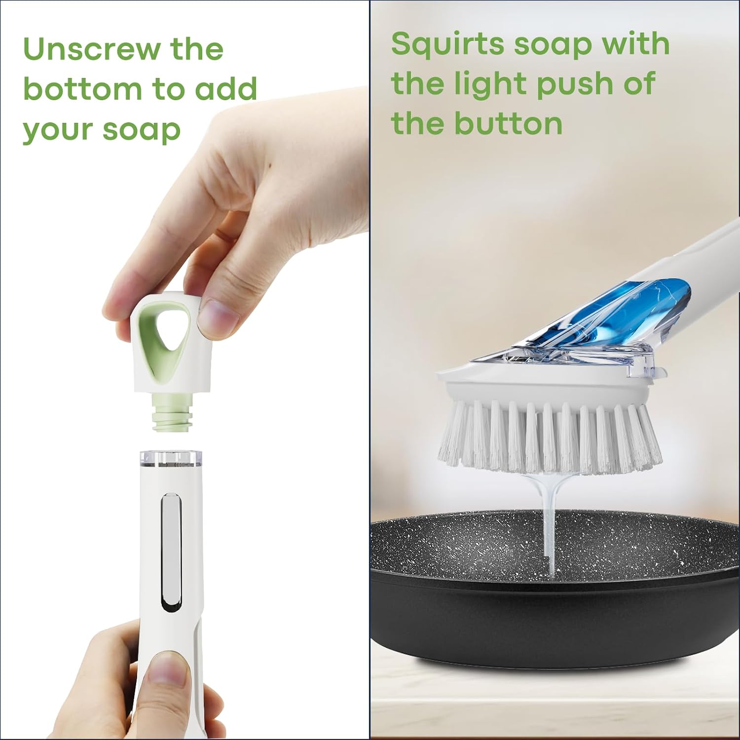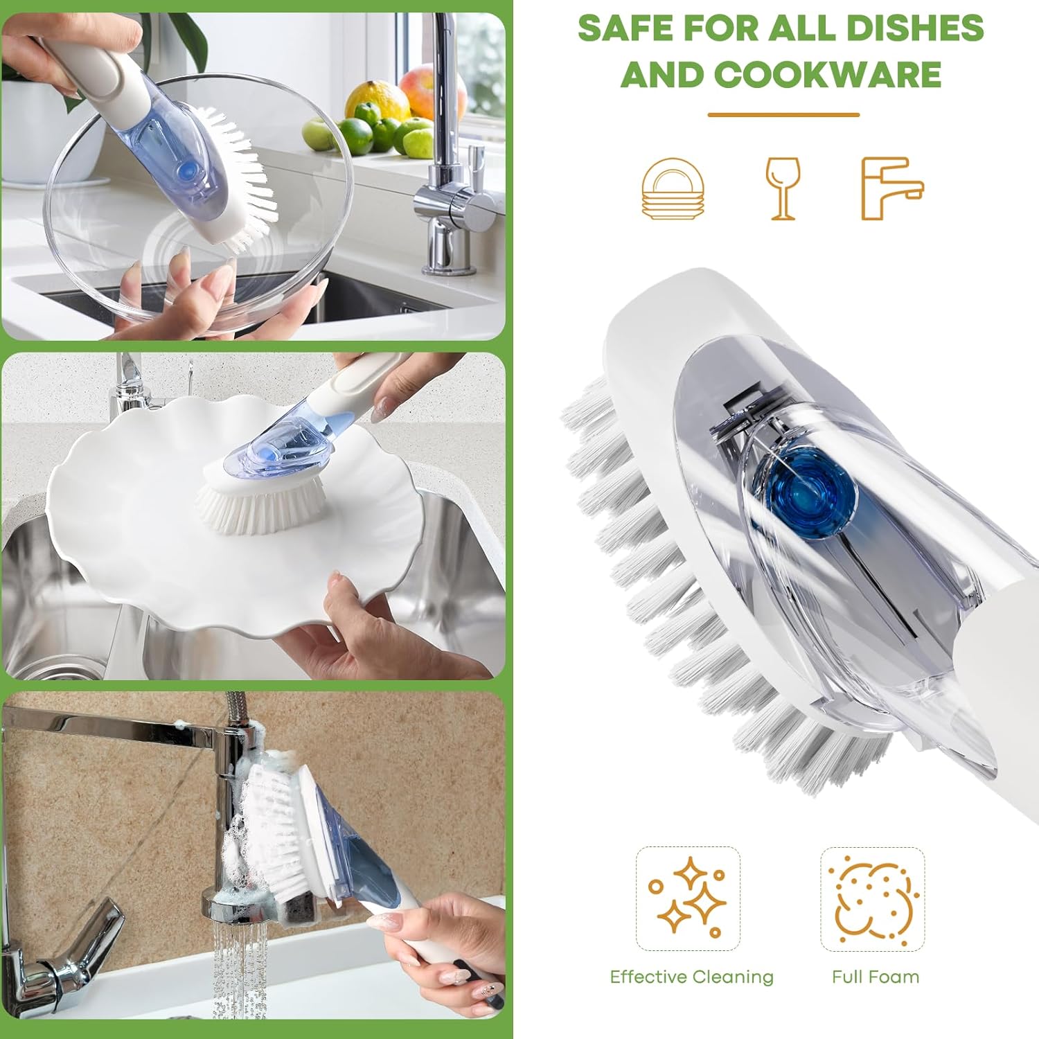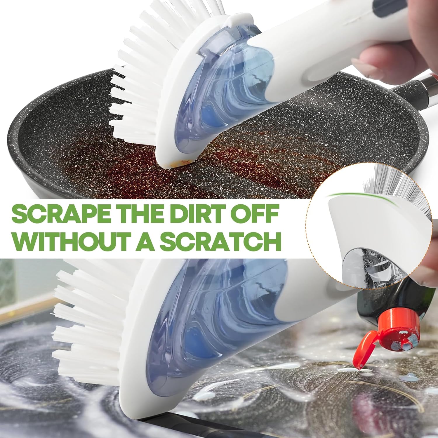 - Built-in Scraper: The dish brush replacement head has a built-in scraper to clean soft and hard food stuck on dish. And the soap dispensing dish brush can be safely used in a non-stick pan