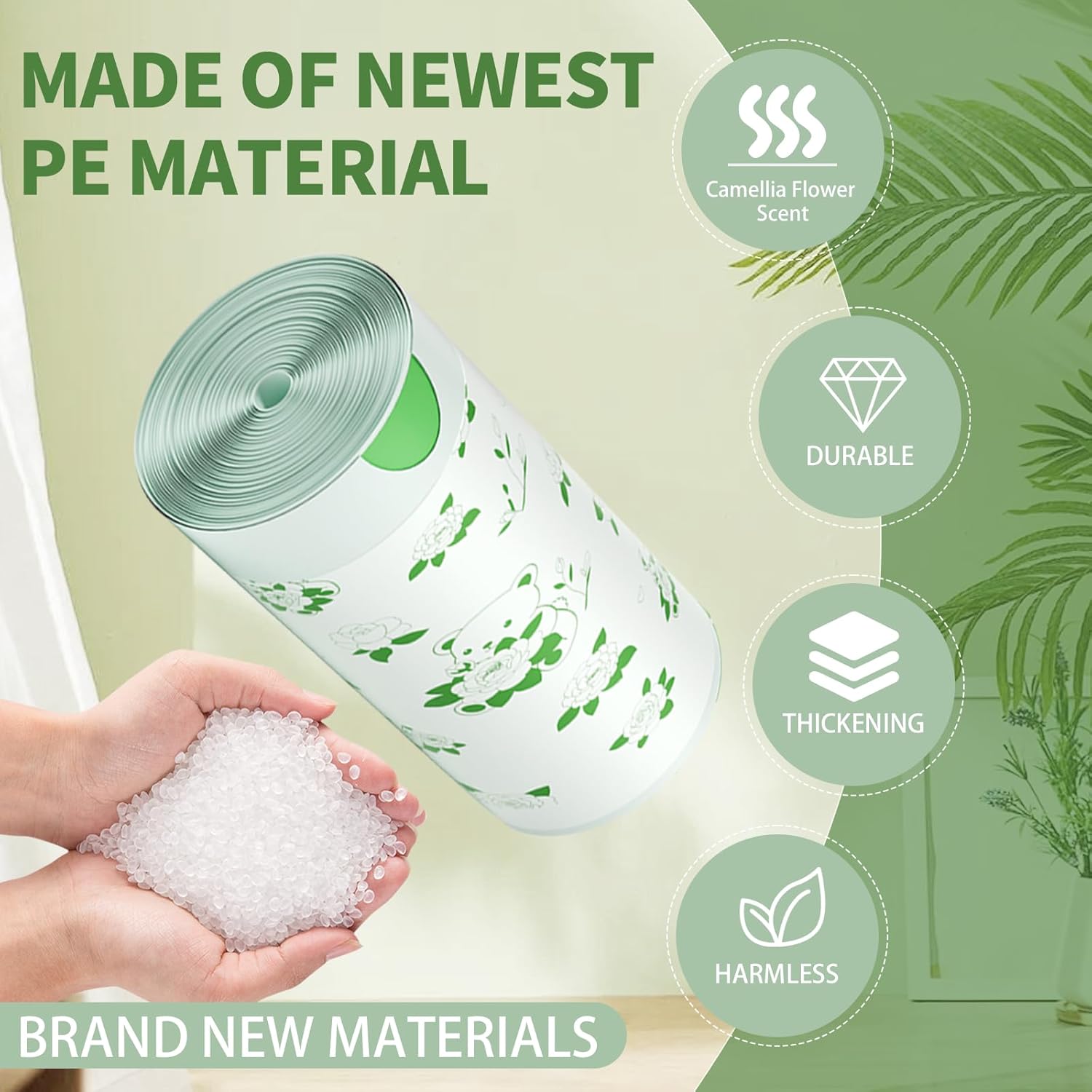 - 【Material and Smell】:All of our small garbage bags are made of HDPE material. This material can make the garbage bag stronger, we also added some camellia flower fragrance to the 8 gallon garbage bag, so the garbage bag will have a slight smell of camellia flower which can properly neutralize some of the garbage smell