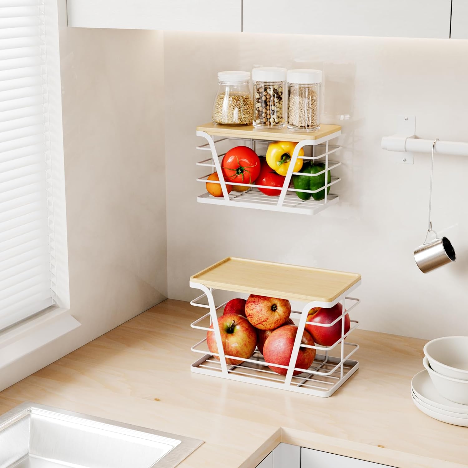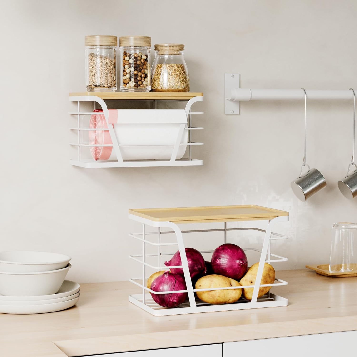 - Versatile Use for Home Organization:From pantry organization to laundry room storage. Assign the large garbage bag dispenser under sinks, use the small wall basket for kitchen sink accessories, or mount both as apartment organization