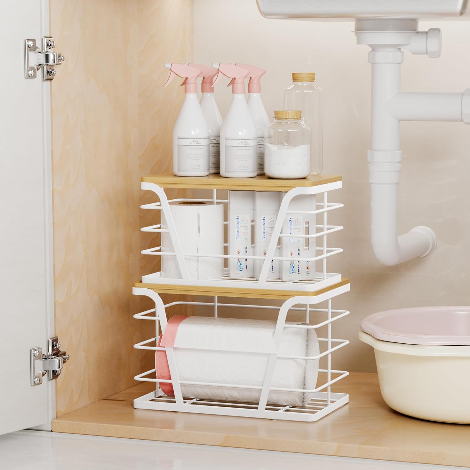 - Thoughtful Design:The large garbage bag holderās removable bamboo cover to hold smaller units in place, creating a sturdy āunder sink organizer tower. Perfect for laundry storage rooms or pantry organizers and storage