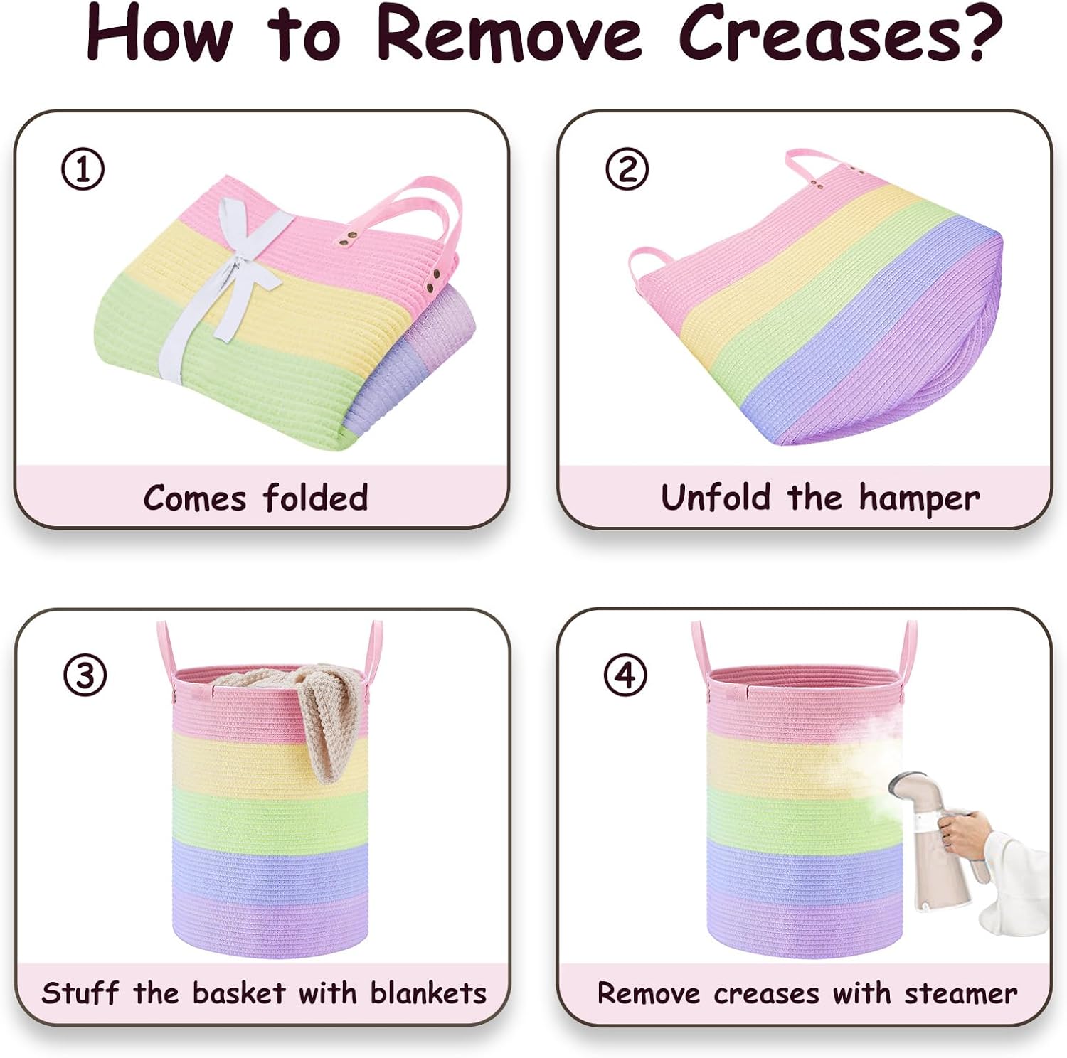 - ❤【WAY TO RESTORE ELEGANT SHAPE】 Our collapsible baskets are folded during shipping. Please fill the hamper with clothes or blankets for a period of time. If you want to remove creases from the surface of the tall basket, you can use a steamer.