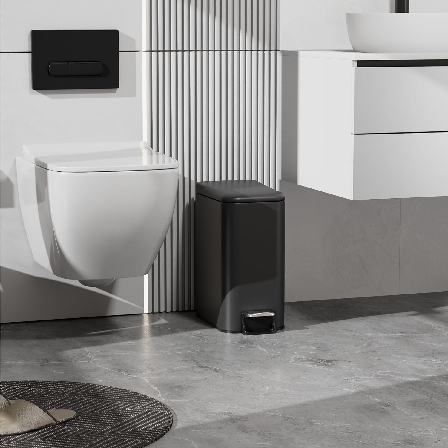 - Silent Soft Close: Hands-free! Simply step the pedal on this small trash can and the lid opens gently and quietly.Enjoy the quiet operation whether you're in the kitchen, bedroom or nursery
