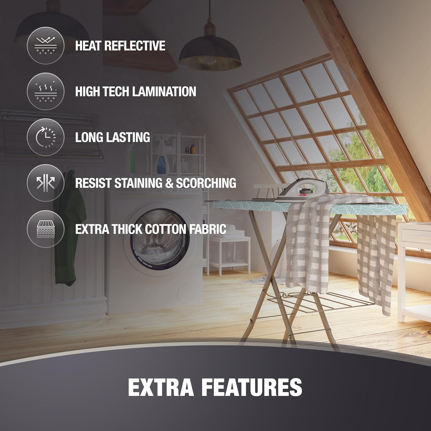 - TIME & ENERGY SAVER : The heat reflective coating of the ironing board cover allows you to iron faster and easier. Thus, you can easily do your ironing work by spending less energy and time. Also this heat-reflective coating technology durable against frequent use.