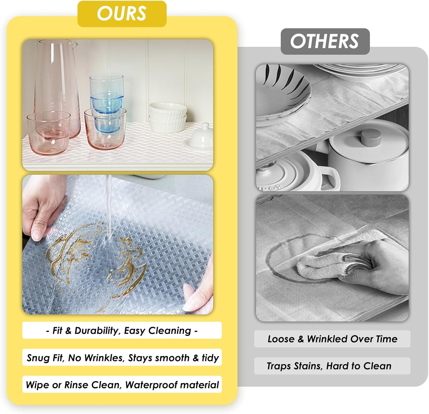 - β Waterproof Drawer Liner β Anti-Slip & Easy to Clean! Secure Grip + Effortless Maintenance β The textured shelf and drawer liner prevents items from sliding, even when opening or closing. Waterproof surface wipes clean instantly with a cloth or rinses under water β no stains, no fuss. Perfect for shelf liners for cabinets that stays pristine!