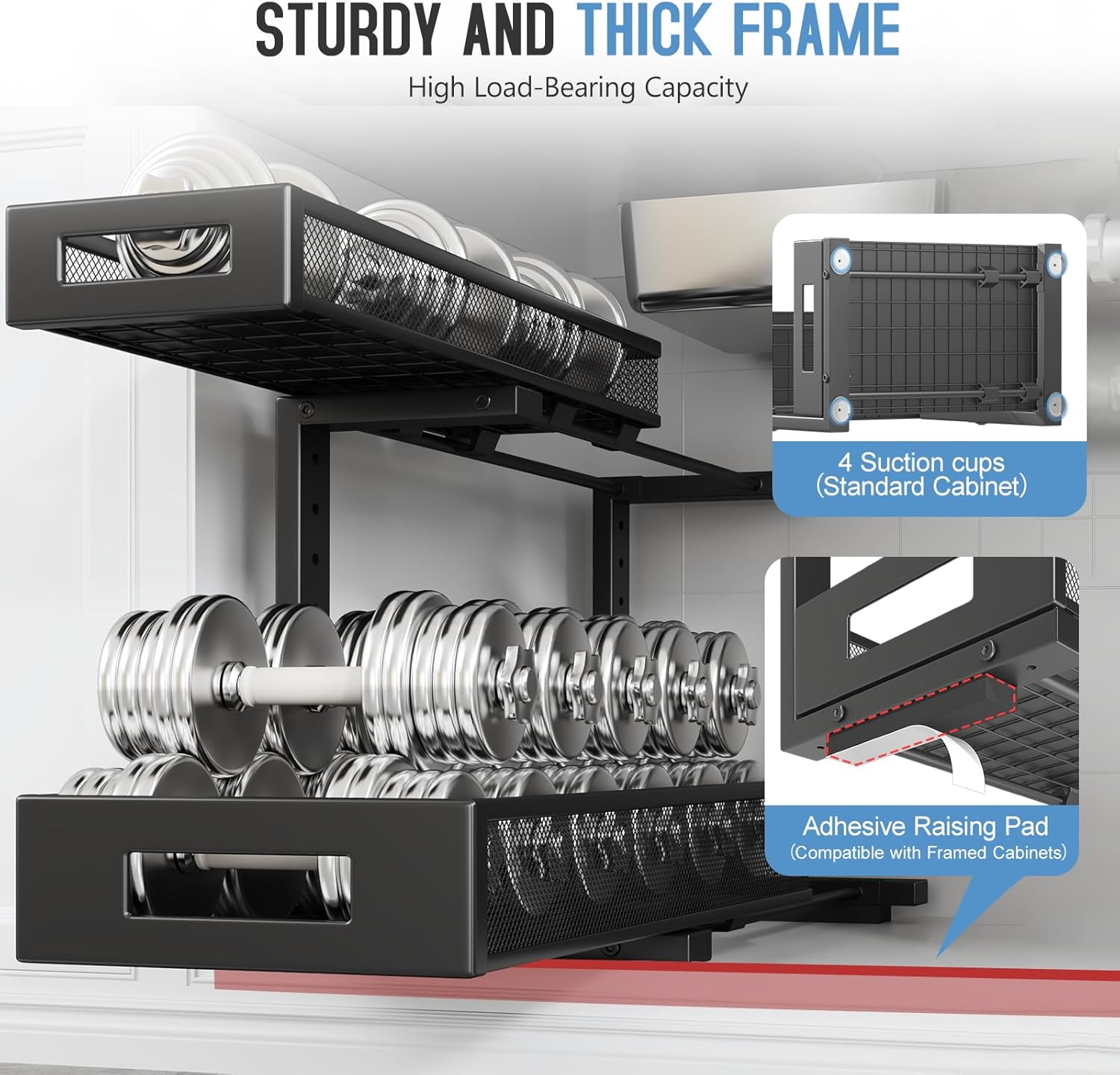 - 【2-Tier Pull-Out Design for Easy Access】This under-sink organizer features a double-layer pull-out design, allowing you to easily access items at the deepest part. The upgraded, thickened iron circular sliding rails ensure a smooth and seamless pulling experience, making each use effortless. The unique pull-out locking mechanism effectively prevents the drawers from being completely pulled out, avoiding the risk of items falling or structural damage caused by over-pulling, ensuring safer