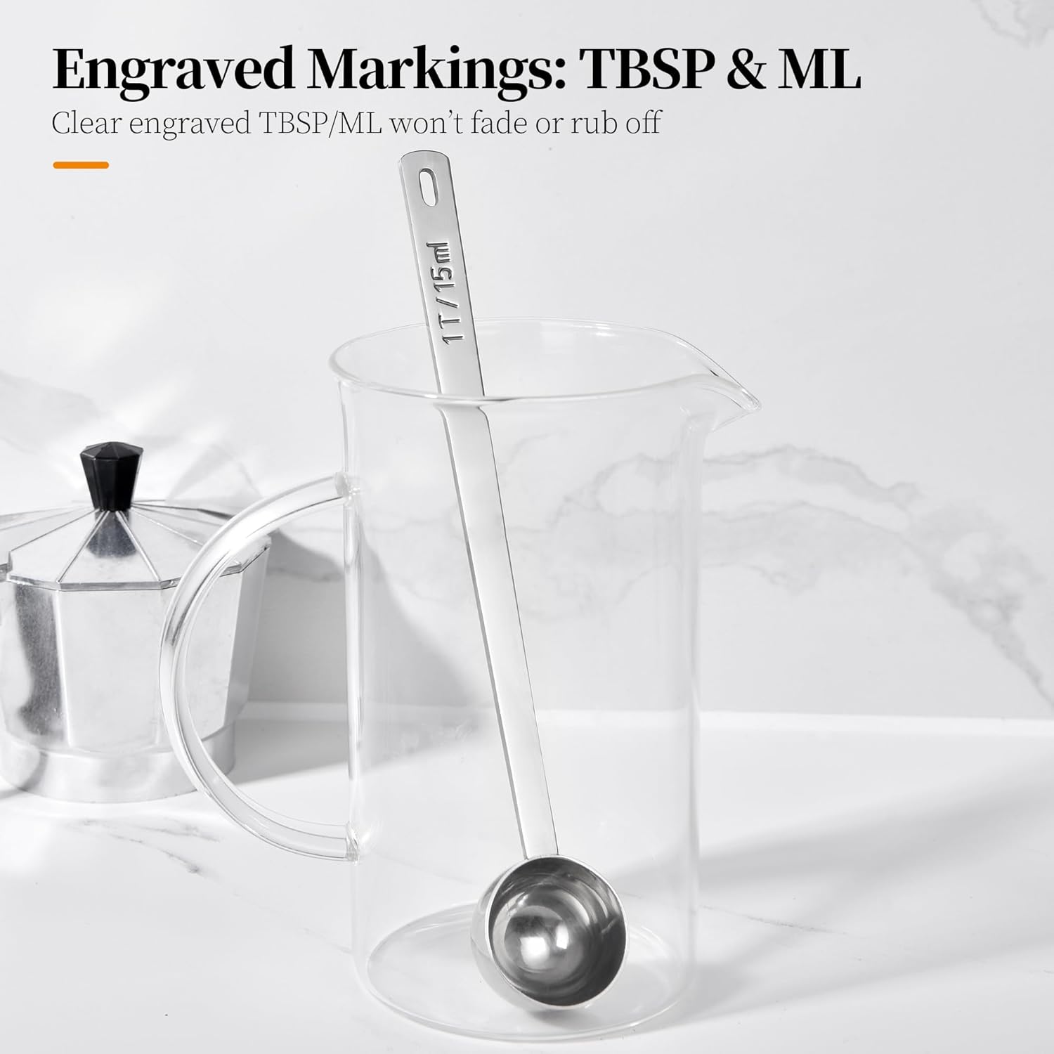 - [Always Accurate – Clear, Fade-Proof Marks] This 1 tablespoon scoop is designed for accurate measuring every time. It holds exactly 1 tablespoon (15ml) - so your coffee always tastes just right. The deep engraved-etched measurement lines on the coffee spoon won't fade or rub off like cheap printed marks, staying clearly visible even after years of daily use. The precisely measured bowl ensures you never accidentally use too much or too little. No fading. No mistakes.