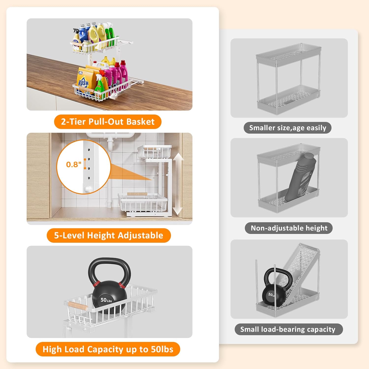 - π Industrial-Grade Stability: Engineered with thicker, heavier steel + 1" reinforced frame, this premium under kitchen sink organizer delivers wobble-free durability for heavy loads. The weighted base design creates rock-solid stability, making it the ultimate long-term under cabinet organizer for bulky detergents