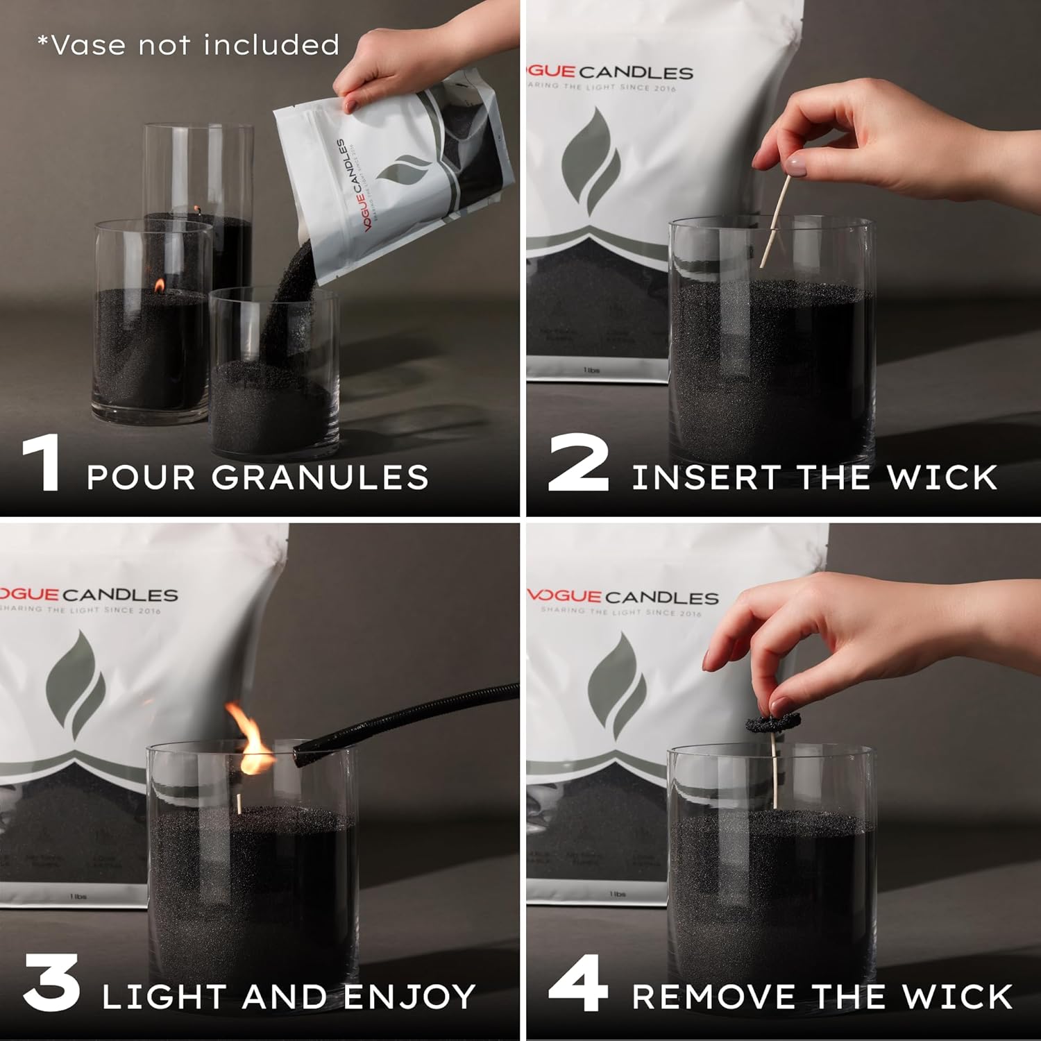 - Create a Candle, Your Way. No Mold, No Mess: Our signature plant based granules turn any vase or vessel into a stunning candle. Each 1LB kit includes 15 clean-burning cotton wicks. Each 5LB kit includes 50 wicks for extended use or gifting. Just pour to 2/3 full, insert a wick vertically, and light. No wax pouring or molds required. Every setup is unique, every candle is yours.