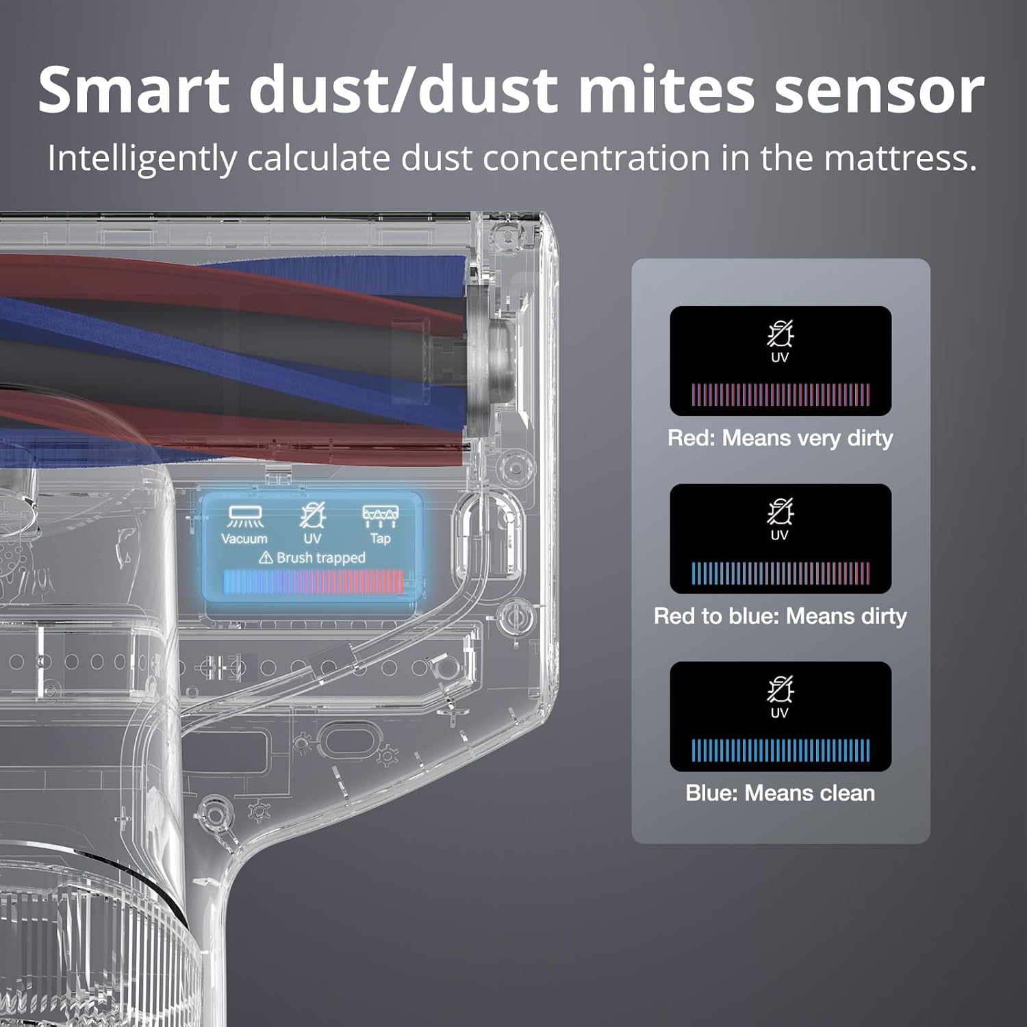 - Intelligent Dust Sensor: Our unique DustSensor technology calculates the amount of dust on your bed automatically, and the LED lights will display the results - red light means dirty, while green light means clean.
