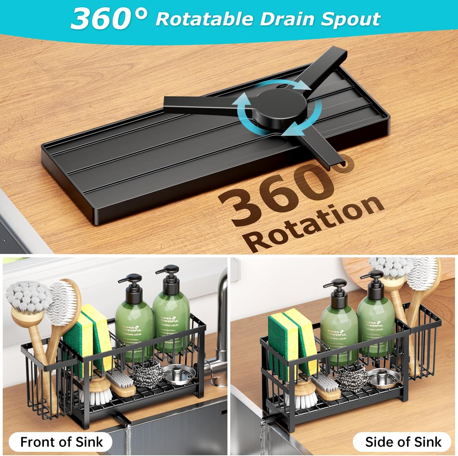 - 360° Rotatable Drain Spout: This kitchen sink organizer rack features a 360°rotatable drain. Water droplets from the sponge can flow directly into the sink after reaching the detachable water storage tray. You don't need to frequently pull out the drip pan for cleaning, reducing the workload in the kitchen, say goodbye to wet sponges and messy sink areas