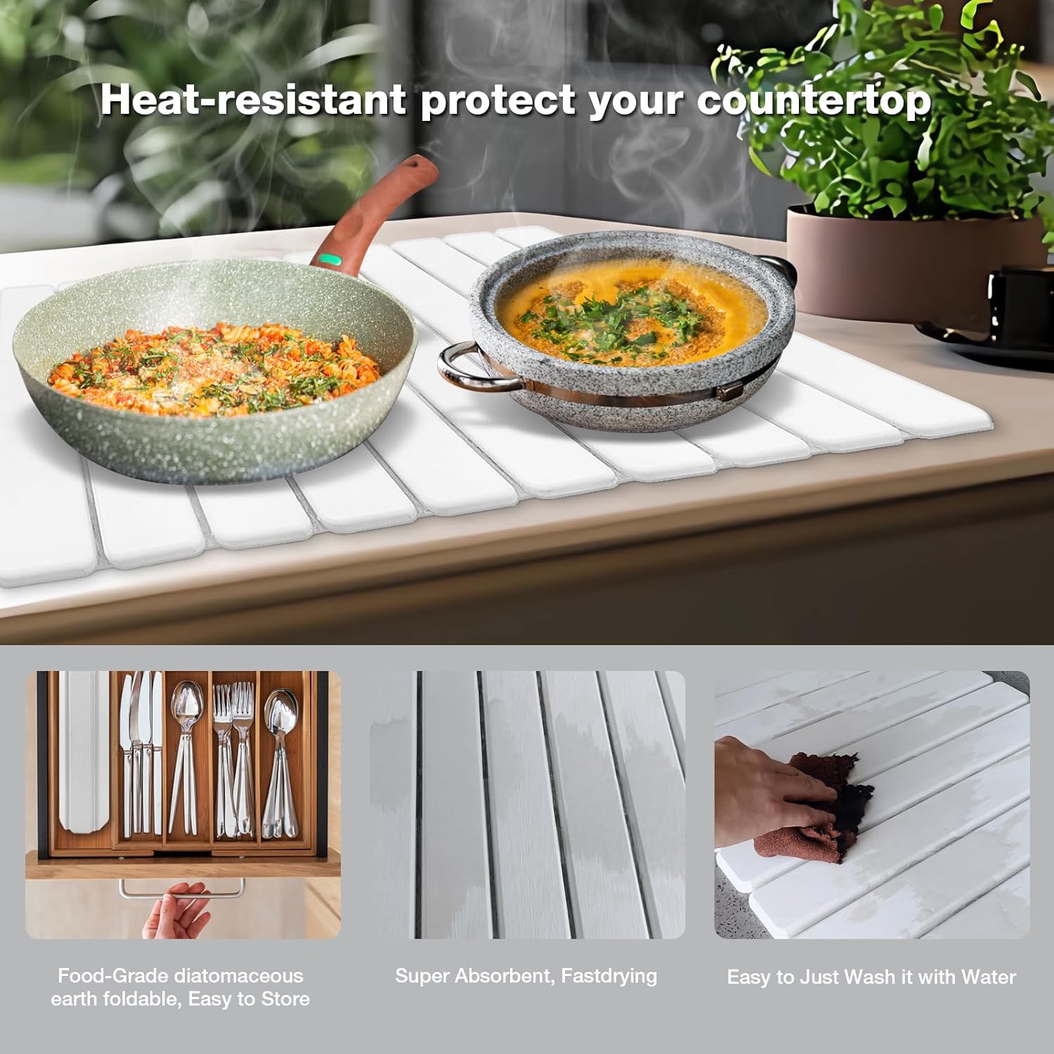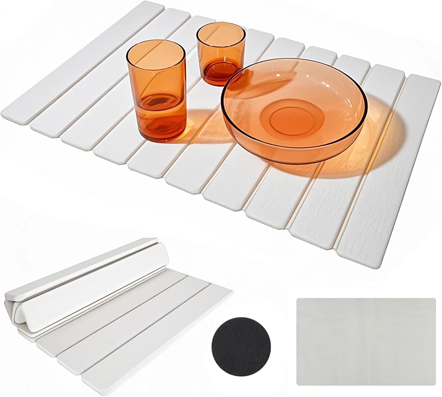 Diatomaceous Earth Stone Dish Drying Mat for Kitchen Counter – 24”x16”, Non-Slip Quick-Dry Surface, Sleek Foldable Design & Collapsible Storage, White