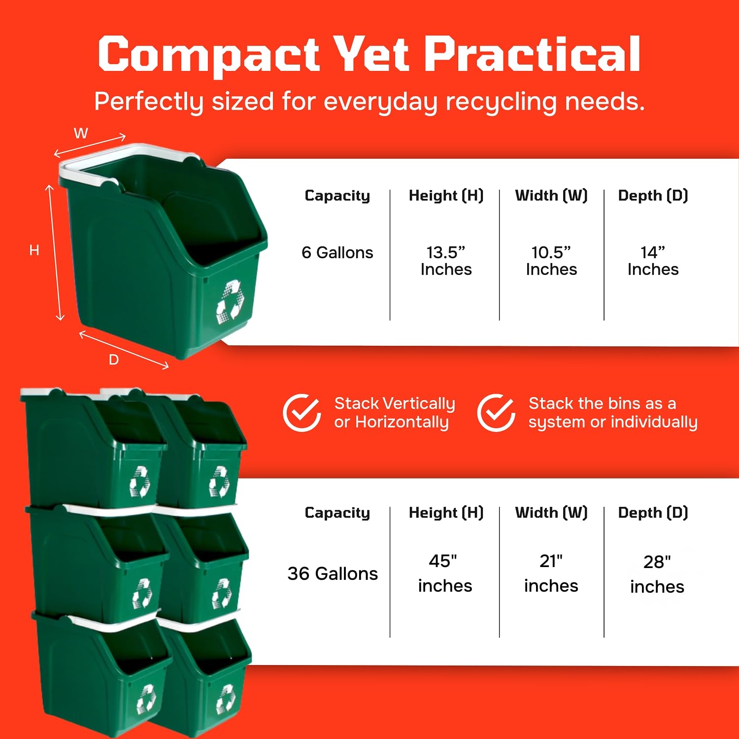 Multi Recycling Bin System with Three Stacking 6 Gallon Bins with Carrying Handles, Stackable and Compact for Offices, Homes, Garages, Businesses - (Green, 6 Pack)