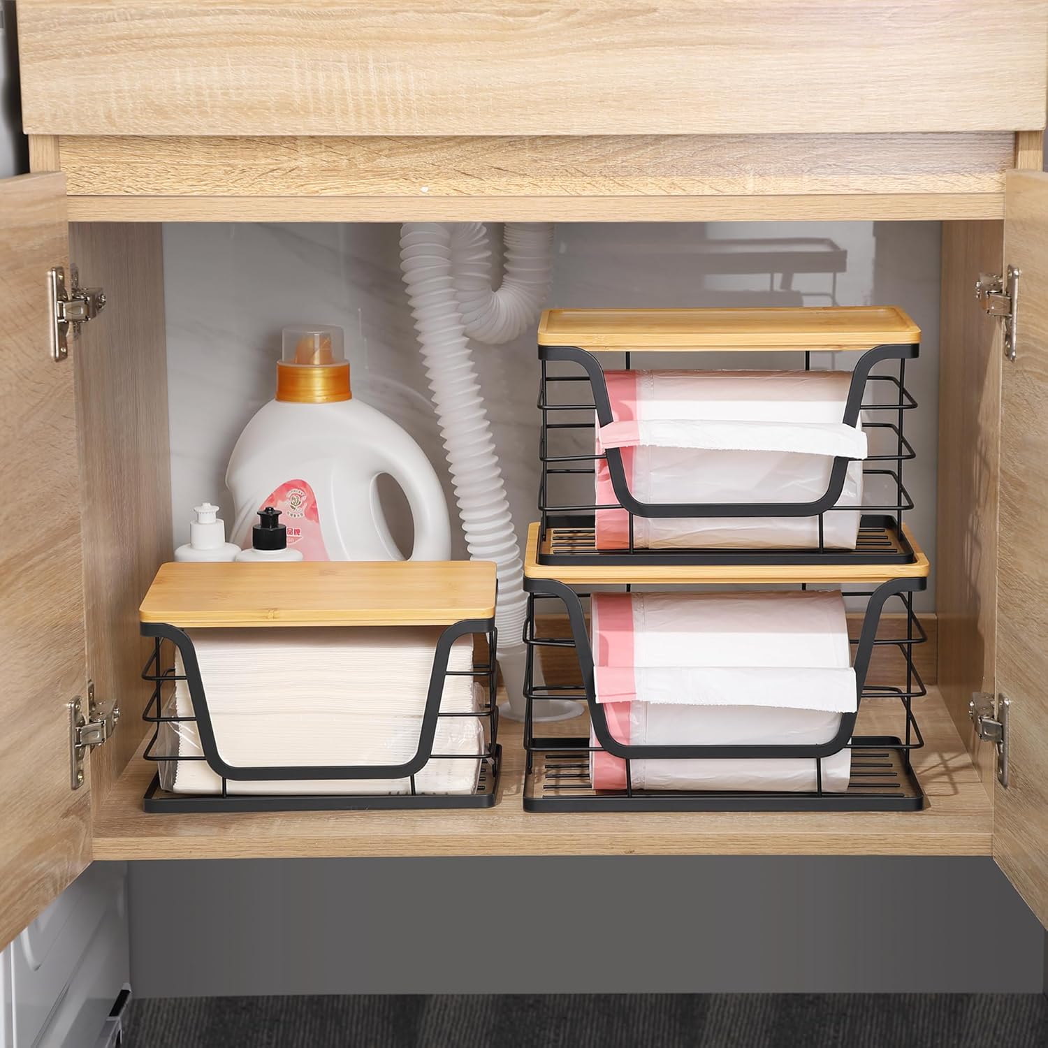 - Stackable Design: The trash bag holder can be stacked vertically to save space to the maximum extent, and the stackable bamboo top can be used to place other items such as bread and snacks. The storage box can be widely used in food storage rooms, under the kitchen sink, or laundry room storage