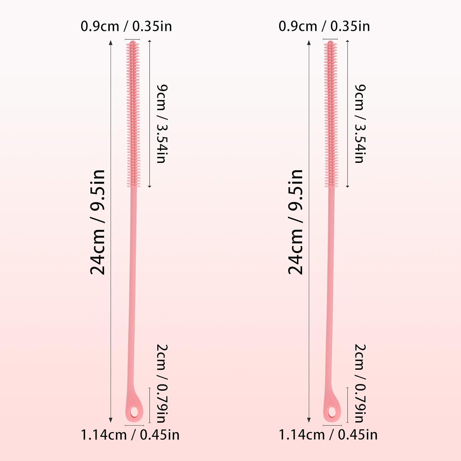 - Package Includes: You will receive 2 pieces of silicone straw cleaner brushes, each measuring about 24cm/9.5in long with a 9mm/0.35in width silicone brush head, perfect for reaching deep into straight, angled, or curved straws, tubes, or bottles for a thorough clean.