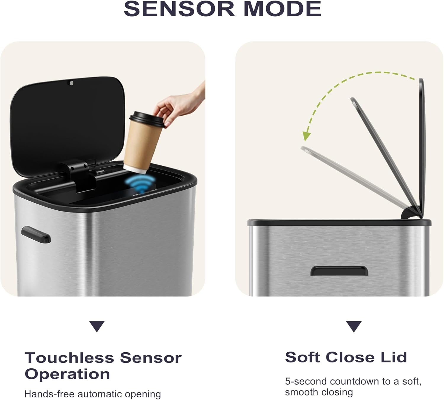 16 Gallon Kitchen Trash Can with Lid, 60L Touchless Motion Sensor Trash Can, Waterproof Brushed Stainless Steel Trash Bin, Automatic Garbage Can for Bedroom, Bathroom, Office, Living Room