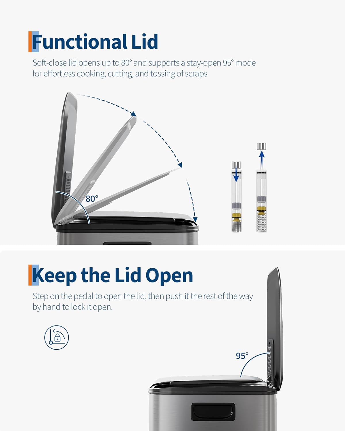 - [PRACTICAL DESIGN] โ GarveeHome's dual trash and recycling bins put ease of use first. Ergonomic side handles let you lift and relocate the entire unit effortlessly. The soft-close lid opens to 80ยฐ without collision with standard kitchen island edges, and locks at 95ยฐ for hands-free cooking prep and scrap disposal. Dual inner buckets with weighted-edge lids trap odors separately. A custom liner ring secures any standard bag snugly, eliminating slips, bunching, and overhang