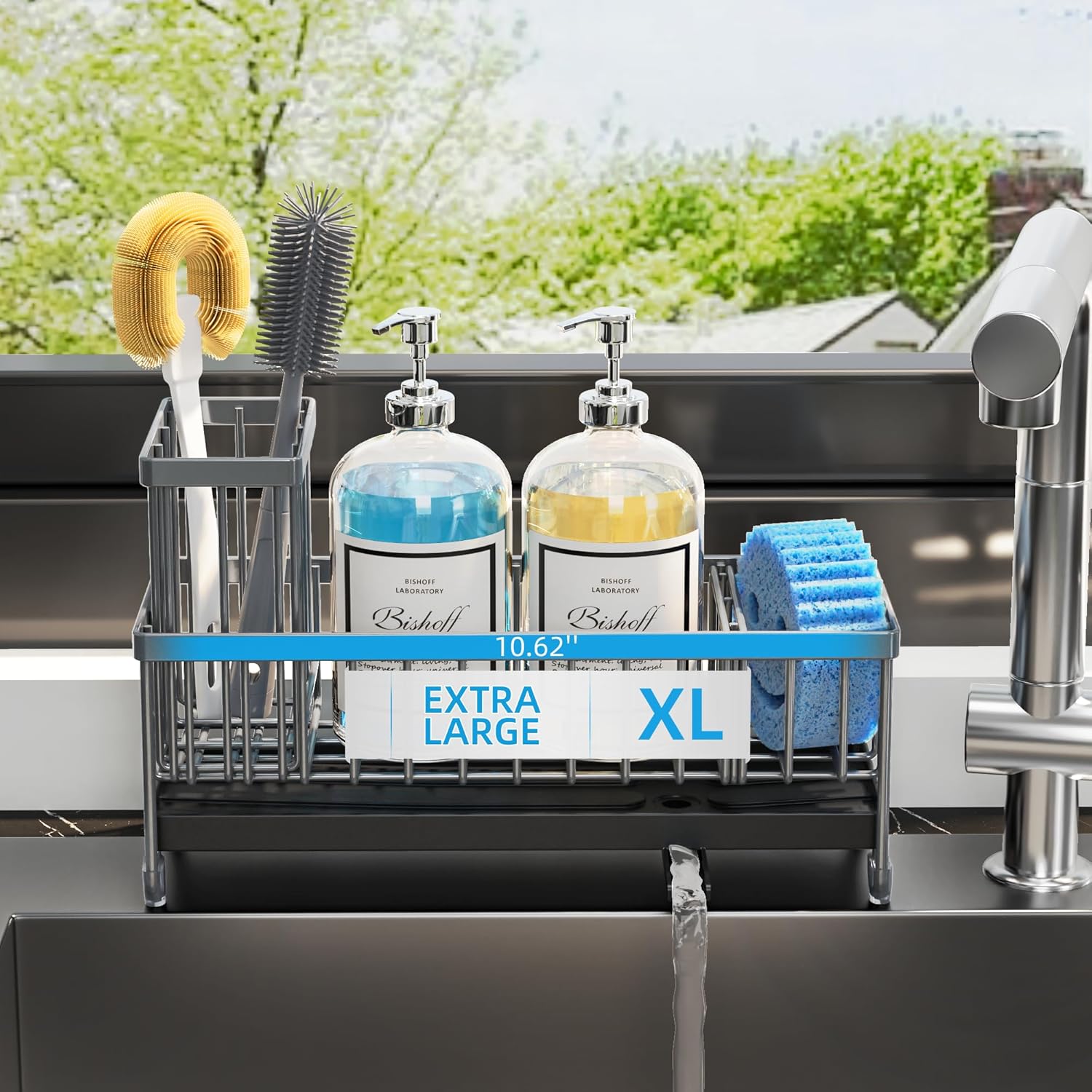- ăLENGTH UPGRADE LONGER VERSIONăMoforoco Lengthen sponge holder has increased the length by 1.37 inches compared to the regular 9.25-inch length on the market, and the total length is 10.62 inches. It means you can accommodate 2 * soap dispenser bottles, 4* brushes, and a sponge, making your storage space easier, accommodating more of your items and saying goodbye to clutter.