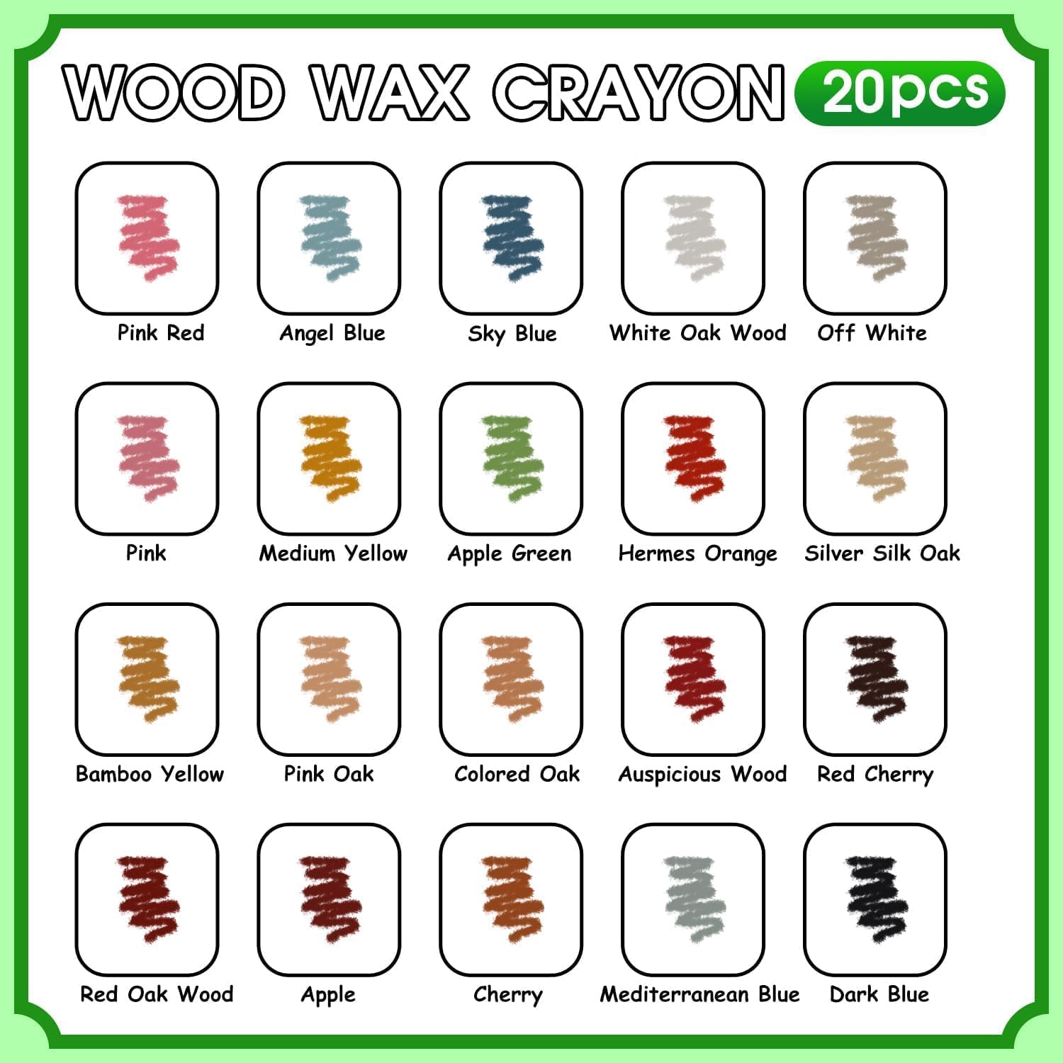 - 【20 Different Colors】: Wood furniture repair kit includes 20 colors: White Oak, Dark Blue, Apple, Red Cherry, Orange, Silver Silk Oak, Cherry, Pink, Mediterranean Blue, Angel Blue, Apple Green, Pink Red, Colored Oak, Auspicious wood, Bamboo Yellow, Pink Oak, Medium Yellow, Sky Blue, Red Oak, Off white