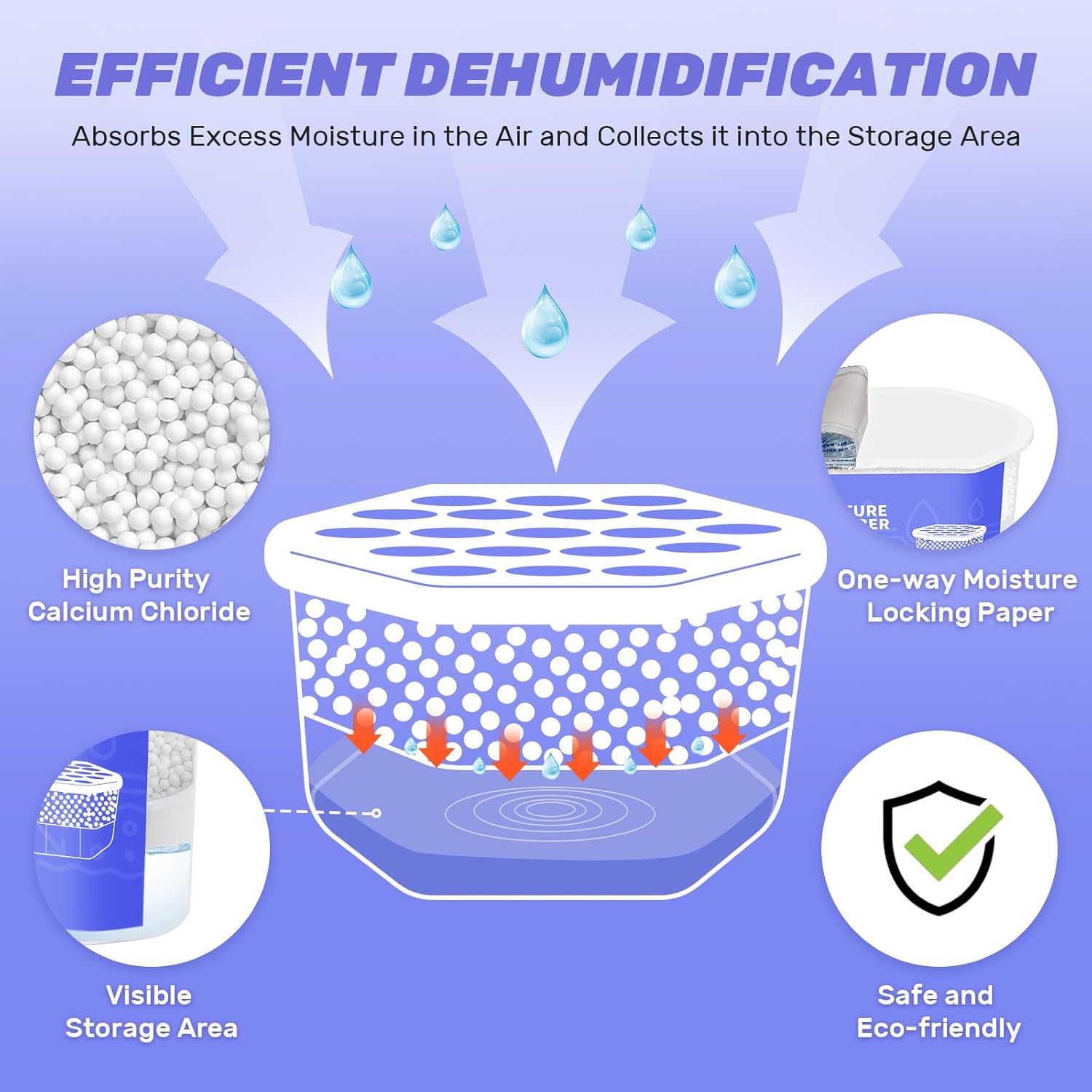 - EFFECTIVE DEHUMIDIFICATION: The CLEVAST dehumidifier boxes feature spherical calcium chloride particles that can attract and absorb excess moisture quickly and efficiently. Moisture absorbers are designed with premium one-way moisture-permeable paper that will securely lock the moisture inside.