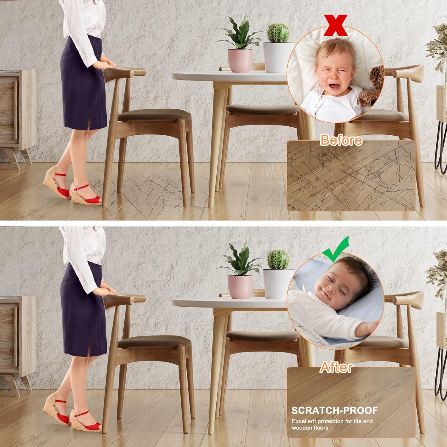 - ❤️STOP SCRATCHING YOUR FLOORS❤️ Place our felt furniture pads on the legs of your furniture to avoid scratching or scuffing your beautiful wooden, laminate or tiled floors. And you never have to hear that annoying scraping noise again. We suggest that the furniture is lifted instead of being slid on the floor in order to prevent the furniture pads from coming off.