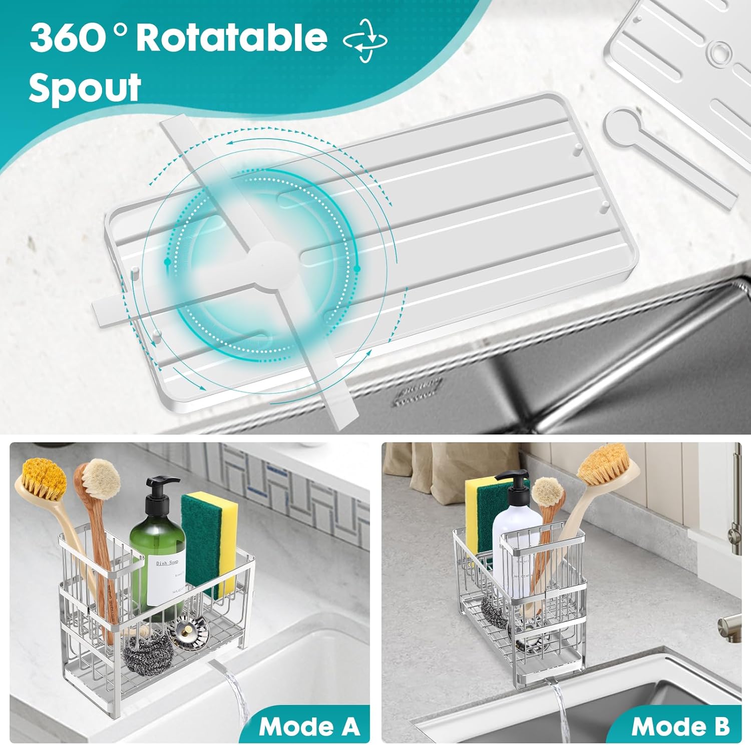 - 【360° ROTATABLE SPOUT】This kitchen sink caddy comes with a rotatable spout, the spout can be rotated 360°. The removable drip tray with a concave center to ensure that the water in the sponge can be directed to the sink. There won't be any water left on the countertop, you don't need to pull out the drip tray to clean it often, saving your cleaning time.