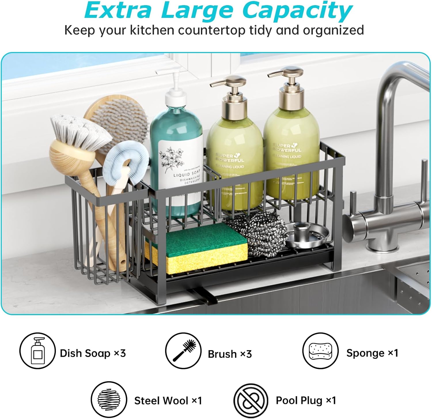 - Upgraded Double Capacity: Liuoud 2 tier sink rack with a brush holder can hold various kitchen cleaning supplies such as hand sanitizers, sponges, dish brushes, sink stoppers, wire balls, etc.It has a large capacity but occupies a very small space, just 9.5inch×4inch which is especially suitable for limited kitchen, keeping the sink countertop clean and tidy