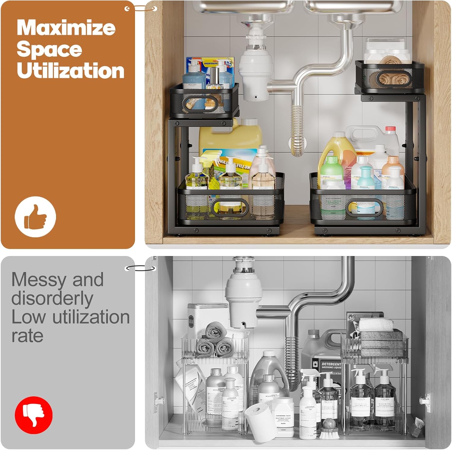 - 【Versatile Storage Solution】Designed with elegant mesh styling and double sliding tiers,undersink organizers blends seamlessly into any space—whether in the kitchen, bathroom,laundry,study,or living area.Perfect for storing seasonings,toiletries,books,or snacks,Sleek and functional.