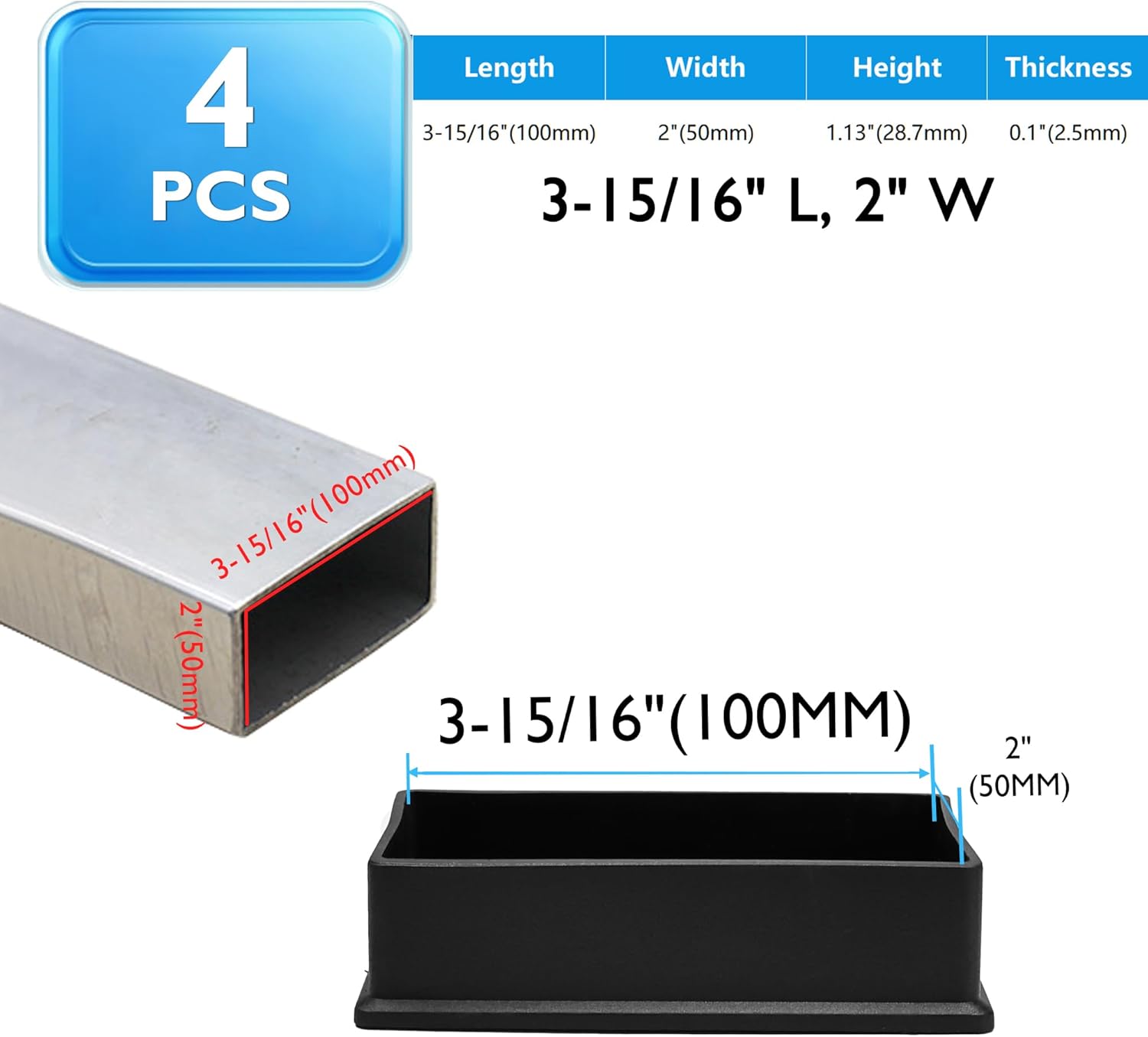 - Dimension and Quantity: 4 black rectangular chair leg floor protectors, suitable for 1.96"x3.93"(50x100 mm) OD rectangular chair legs; We offer different size options,including 1" x 4" rectangular chair feet, allowing you to find the perfect fit for your specific needs (Please confirm that you are measuring the outside, not the hole)