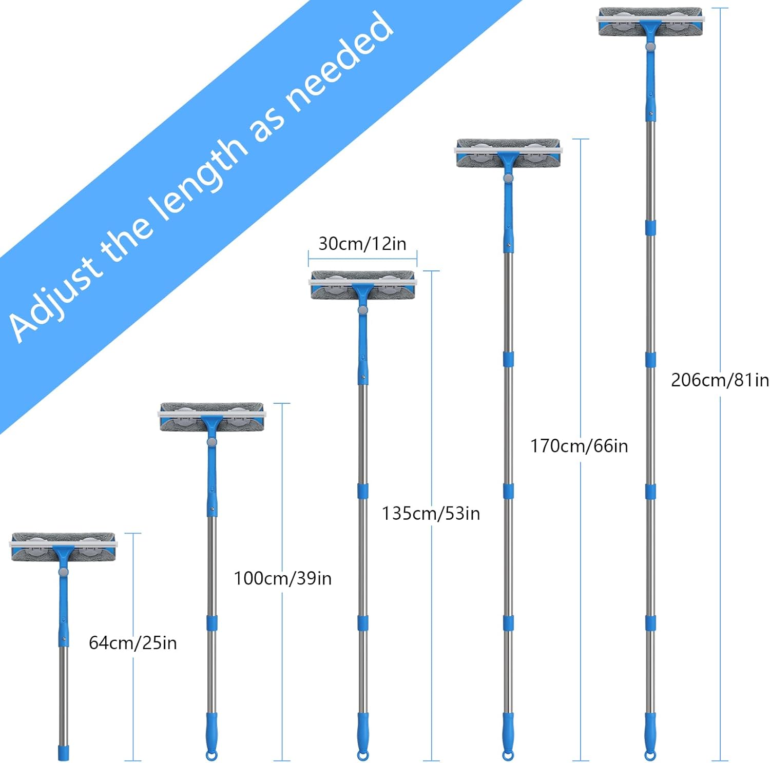 - Easy to Clean Windows: 2-in-1 Window Cleaning Tool with 5 section of extension pole, you can easily adjust the handle length according to your needs, covering different window cleaning jobs. Mitclear Squeegee for window cleaning includes another two parts, super silicone squeegee blade and premium microfiber scrubber. The microfiber scrubber to wet and clean windows, and the squeegee to wipe off water. This window squeegee is one must-have tool for you to quickly, effortlessly and efficiently clean home indoor & outdoor windows.