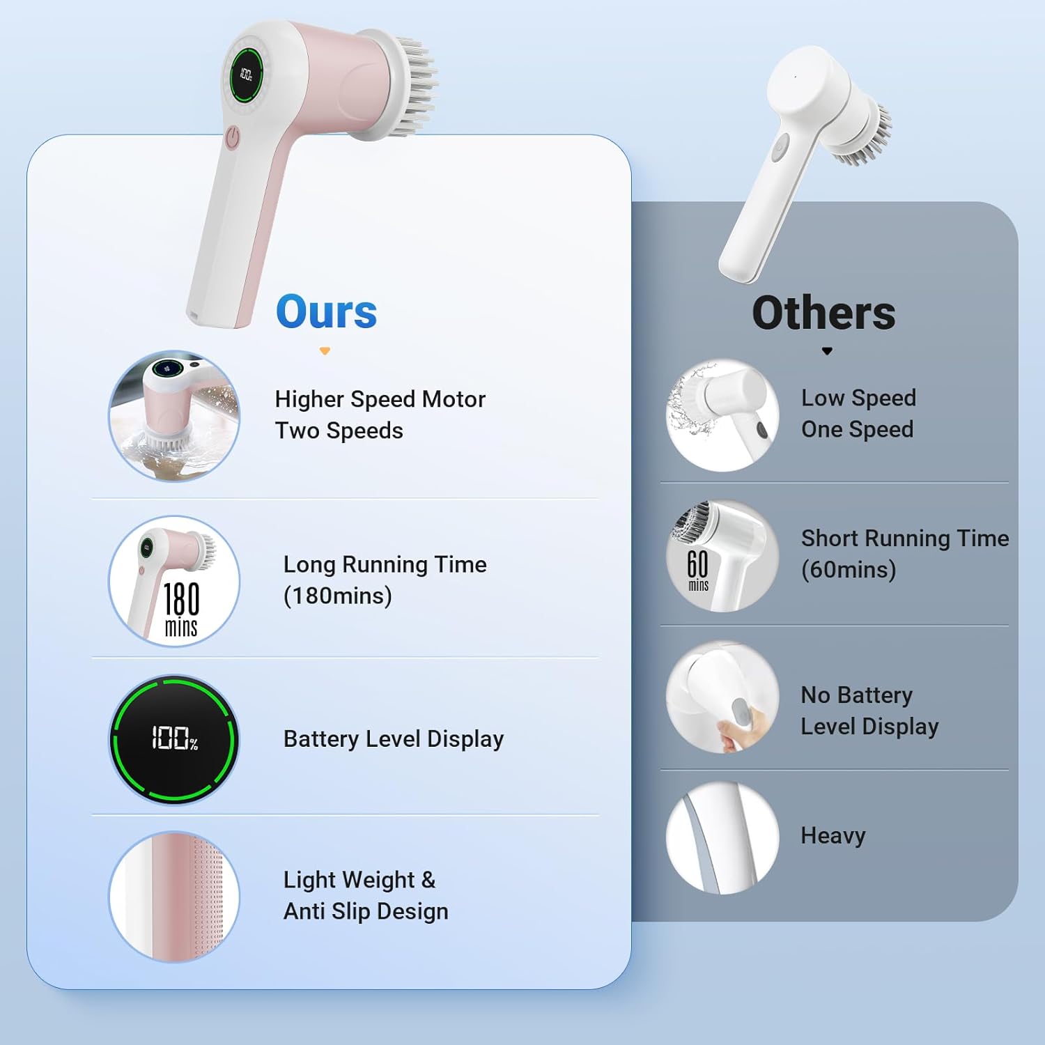 - 2 Speed Efficiency Cleaning: Featuring an upgraded motor, our effective electric scrubber reduces cleaning time by up to 70%, 2 adjustable spin speeds, 350 RPM (For Normal Clean), 400 RPM (For Deep Clean), one-click switch. Stubborn stains, soap stains, dirt and more will be removed in minutes. You'll have more time to do the things that make you enjoy life instead of cleaning!