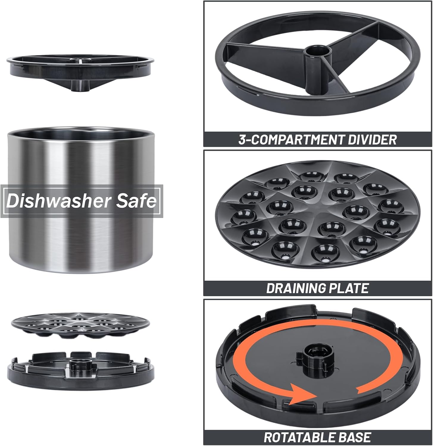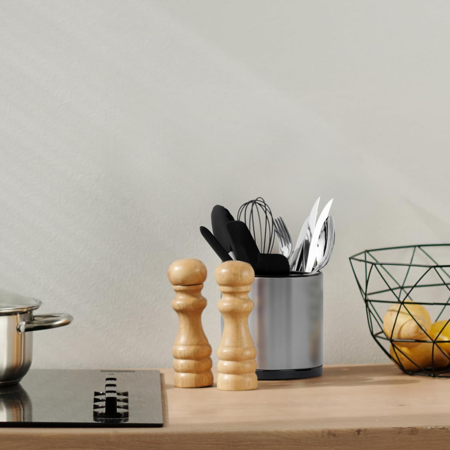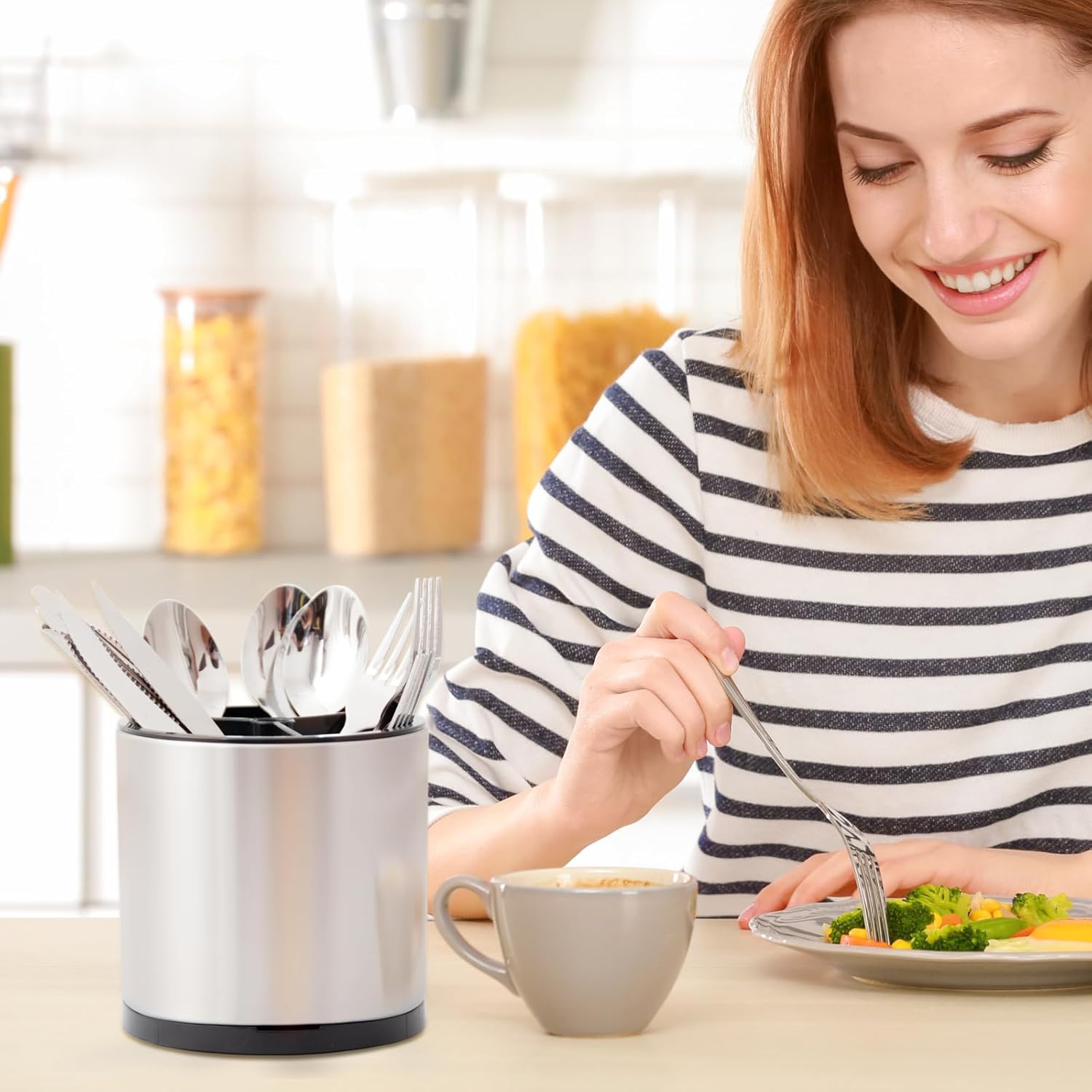 - 360° rotating silverware holder. The base of the flatware organizer, rotating smoothly without wobbling, makes it easy to access cutlery. 4 non-slip rubber feet help keep the silverware caddy from tipping when rotating, and prevent scratches on countertop