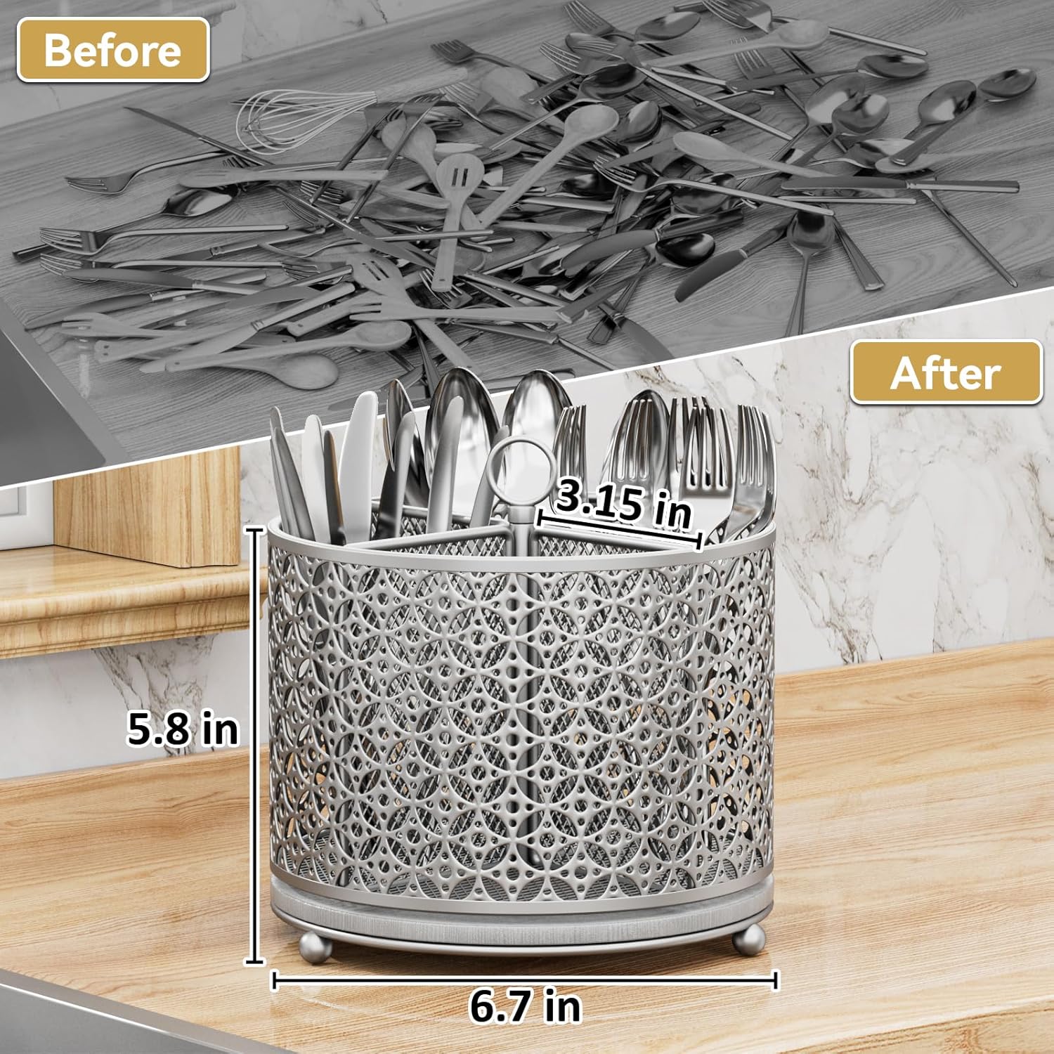 - 360°Rotating Silverware Organizer: This kitchen counter organizer offers a rotating design that makes your utensils easy to access .The rotation is smooth and effortless, adding a touch of modern functionality to your kitchen. Space-saving holder can perfectly organize your knife, forks, spoons etc. No more digging through the drawers or laying messy on the table. Just a simple spin to get what you need. Perfect utensils container for RVs, small kitchens