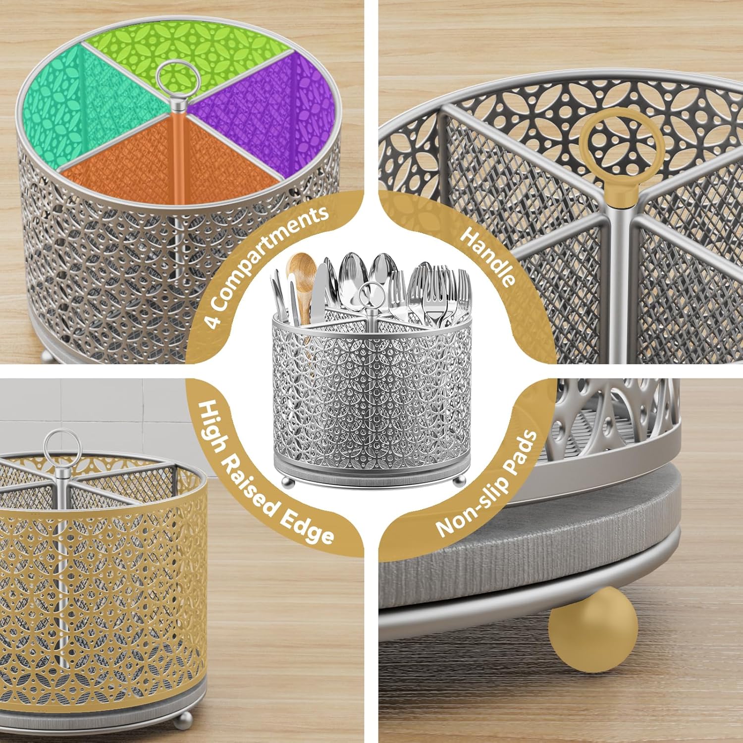 Rotating Utensil Holder for Kitchen - Silverware Caddy Fast-Drying Flatware Organizer 4 Compartment Large Cutlery Holder Utensils Caddy with Handle For Kitchen Countertop Party Picnic Table Silver