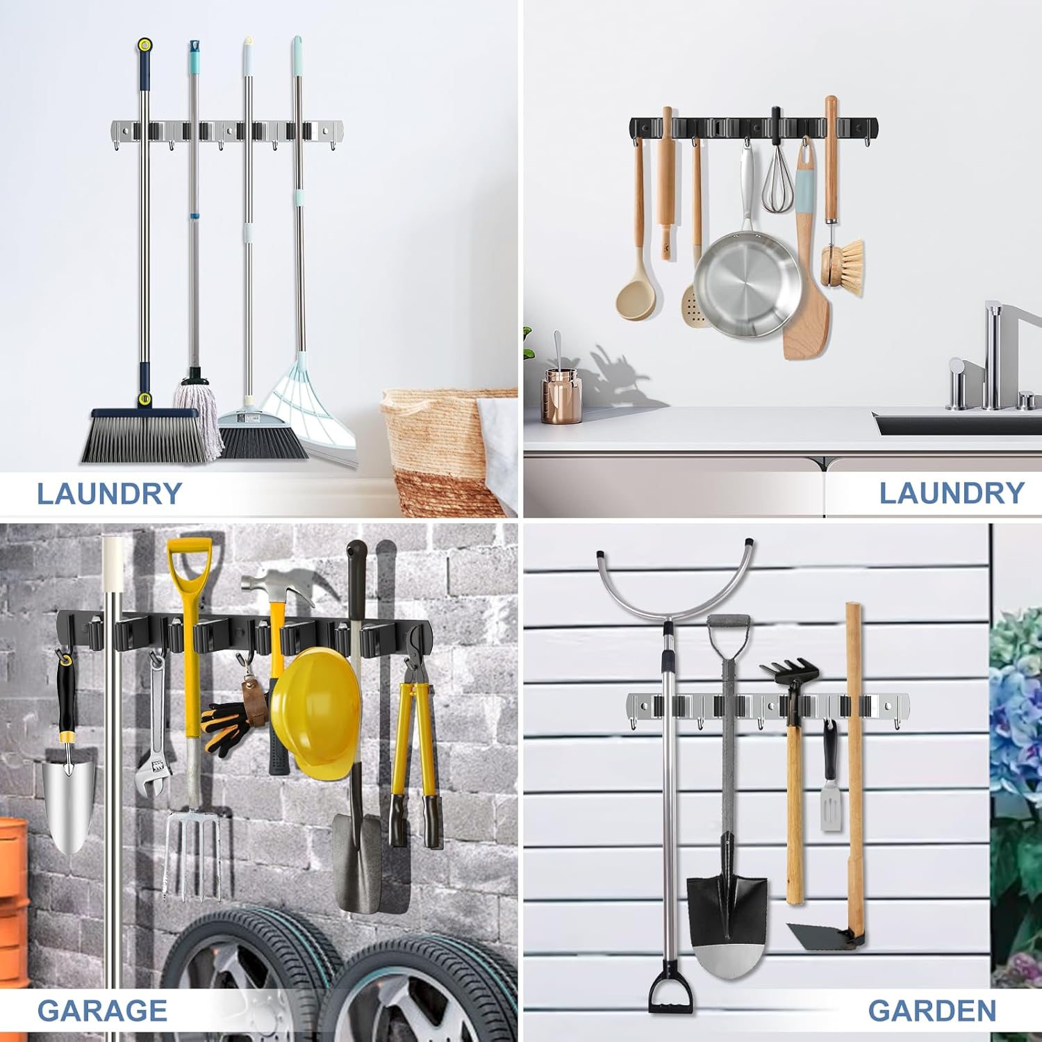 - VERSATILE DESIGN: You can easily organize your home, such as laundry room, kitchen, garage, storage room. This garage organization is also suitable for garden or shed. You can easily use broom, mop, vacuum, dustpan, rake, shovel, etc. Will keep your house clean and tidy