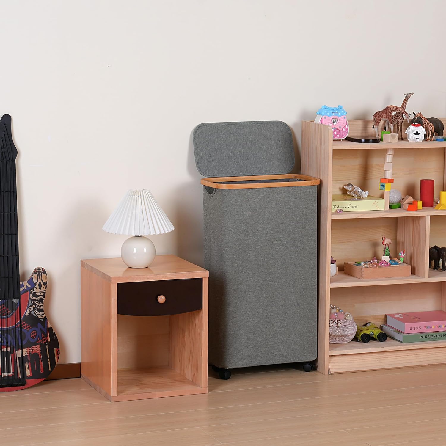 Slim Laundry Basket with Wheels,Narrow Hampers for Laundry, Laundry Hamper with Lid&Bamboo Handles,Dirty Clothes Hamper for for Bathroom Bedroom Dorm, 60L Grey