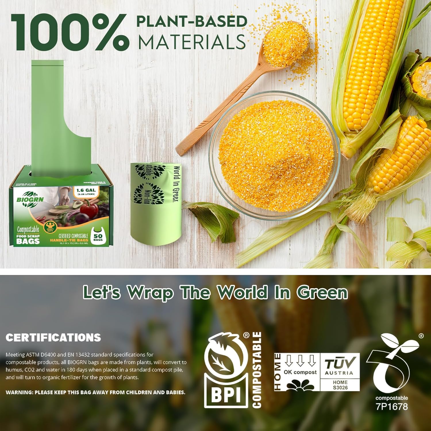 - Perfect Fit for Small Spaces:These 1.6 gallon compost bags (16"x19.3") are ideal for compact kitchens and countertop bins. Each roll contains 50 handle-tie kitchen bags for easy use. Our compostable bags fit standard 1.6 gallon trash cans perfectly while reducing your environmental footprint.