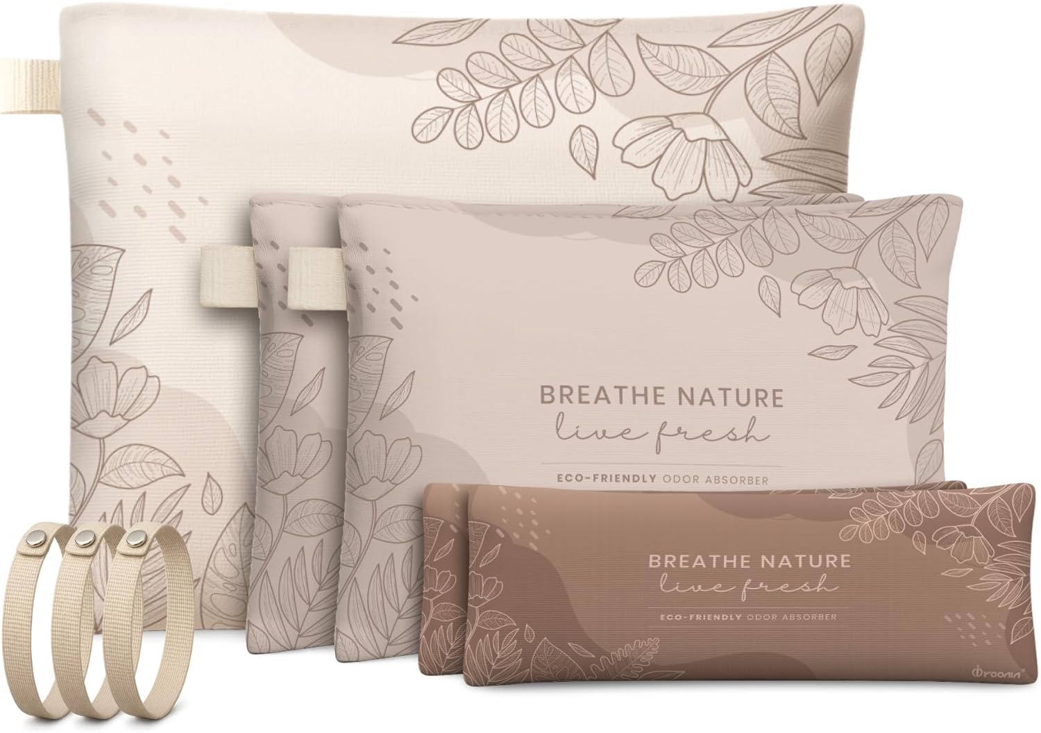 - NATURAL ODOR ABSORPTION TECHNOLOGY: – Harness the power of bamboo charcoal bags to naturally purify your living spaces. This advanced odor absorber targets moisture and bad smells at the source—perfect for closets, cars, bathrooms, shoe racks, cat litter boxes, cabinets, and even the basement.