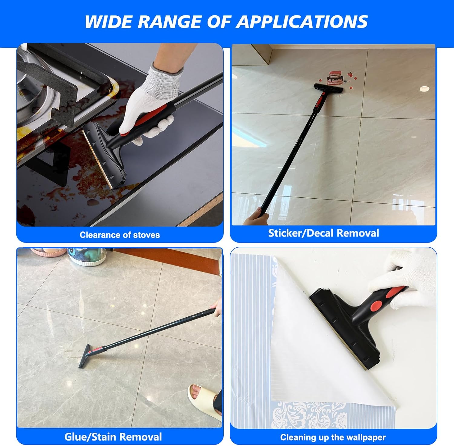 - MULTI FUNCTION PAINT SCRAPER TOOL: This long handle scraper tool is ideal for removing wallpaper, cleaning floors, glass and tile. Ideal for tough jobs on floors, walls and ceilings, such as cleaning tiles, wallpaper, floors, painted floor chips, wall tape, peeling paint, bathroom glass stickers and more