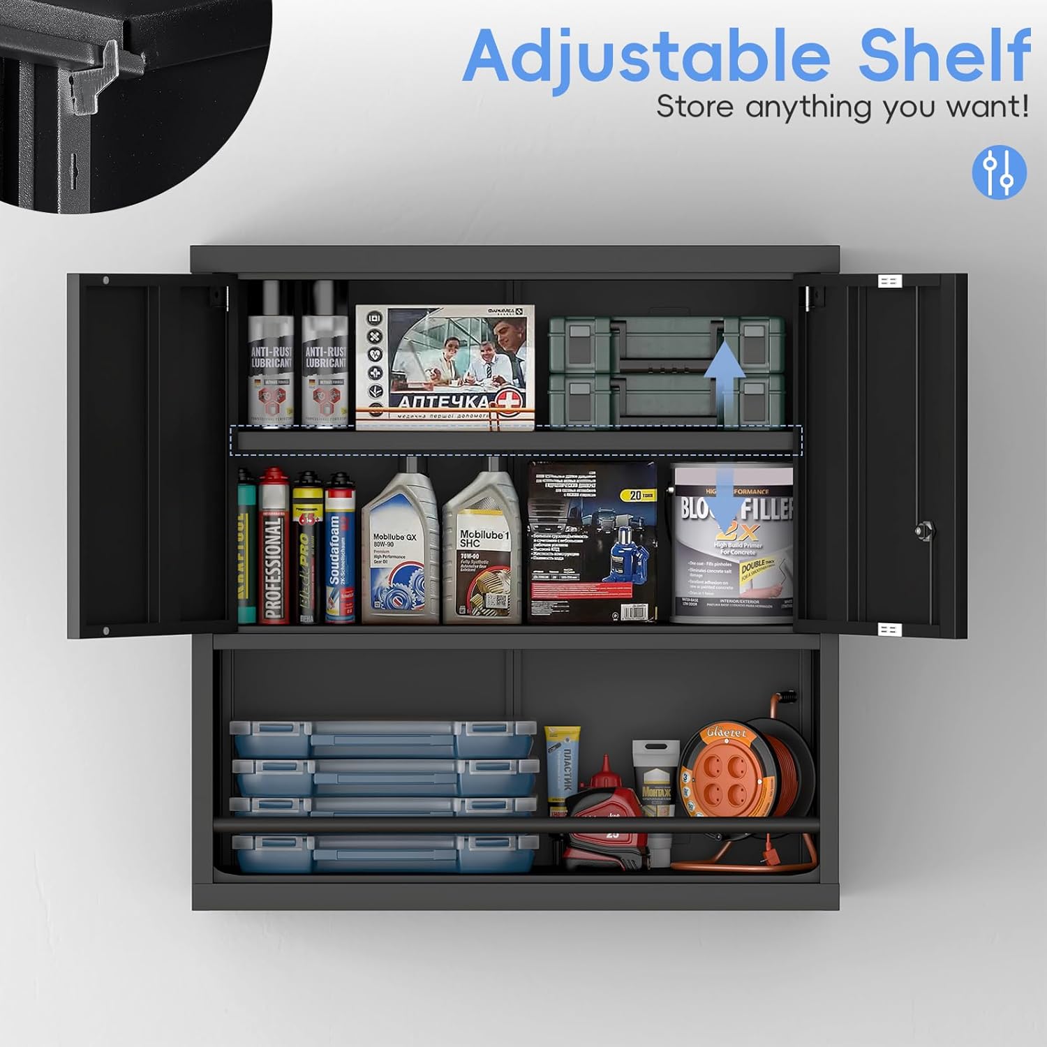 Locking Cabinet, Black Wall Storage Cabinet with Shelves, Hanging Cabinets with Open Storage, Small Wall Cabinet, Lockable Tool Cabinet for Basement, School, Office