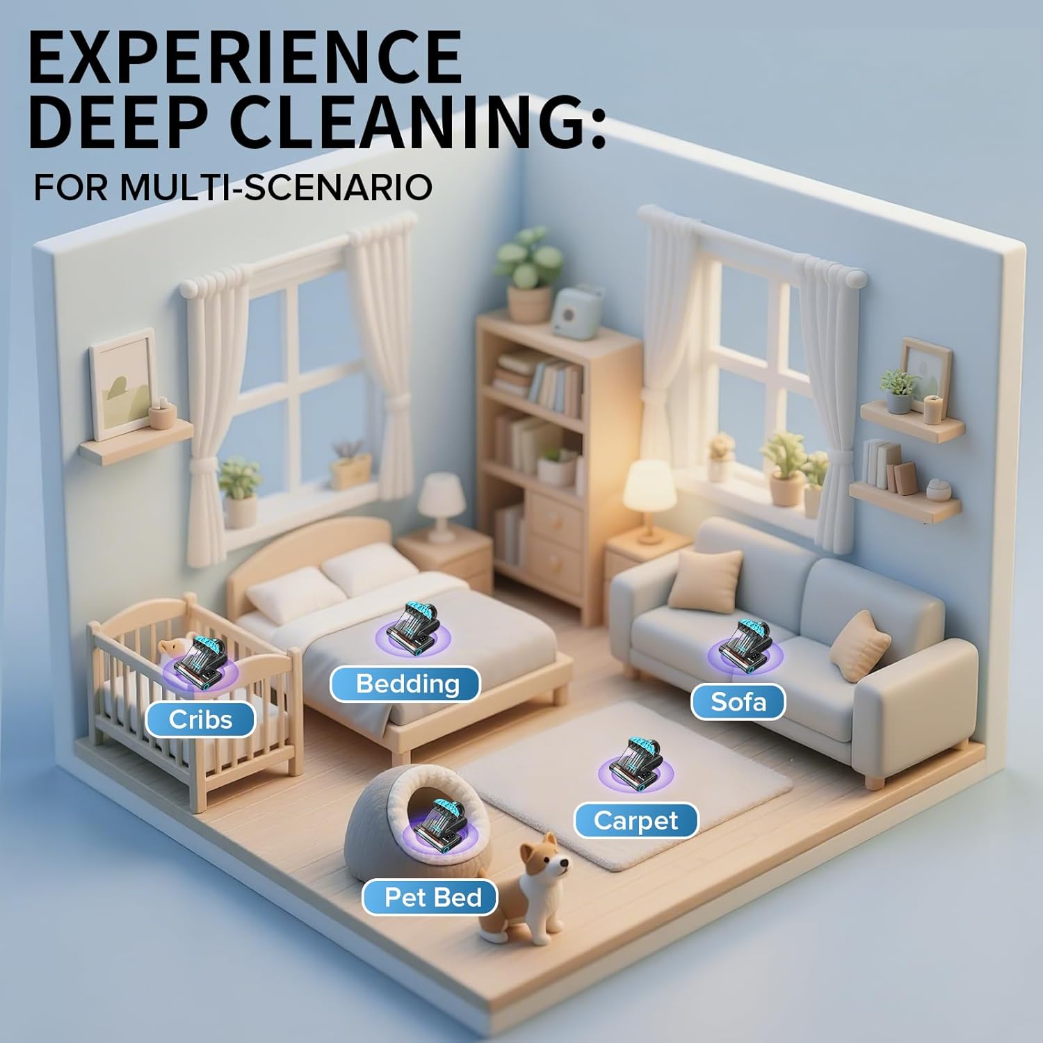 - 3-IN-1 Deep Cleaning: Equipped with 253.7nm u-v, 140ยฐF (60โ) hot air, and a high-frequency rotating brush, our vacuum targets dust, pet dander, and debris from mattresses, sofas, baby cribs, pet beds, and carpets. Perfect for homes with pets or babies. Note: UV activates only when the machine touches the mattress directly; lifting it pauses UV instantly