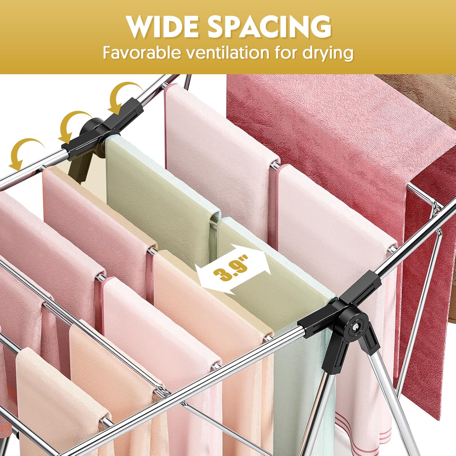 - Large Drying Space: Our drying rack is divided into two tiers, the two drying wings unfold to a width of 56.4 inches, and drying quilts is no problem, the lower tier is designed for hanging smaller items such as socks, towels, etc., with a total of 23 rods, providing spacious drying space for the whole family!