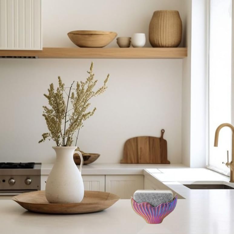 - 【Sized for Sponges】 This sink sponge holder measures 3.4 in tall, 2.2 in wide, with a 5.7 in slot—perfect for most standard sponges. It also offers a unique double-sided design with two style options, including one side that shimmers with iridescent rainbows and another that features an elegant blue and silver finish, allowing you to effortlessly complement your kitchen’s decor.