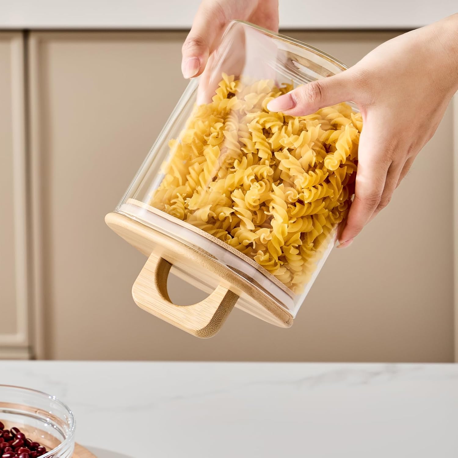 - Easy-Lift Seal Lid。 Unlike traditional bamboo lids, our jars feature a convenient lift-handle design for effortless opening and closing. The airtight seal keeps out dust and moisture, locking in freshness for dry goods like coffee, tea, and snacks.
