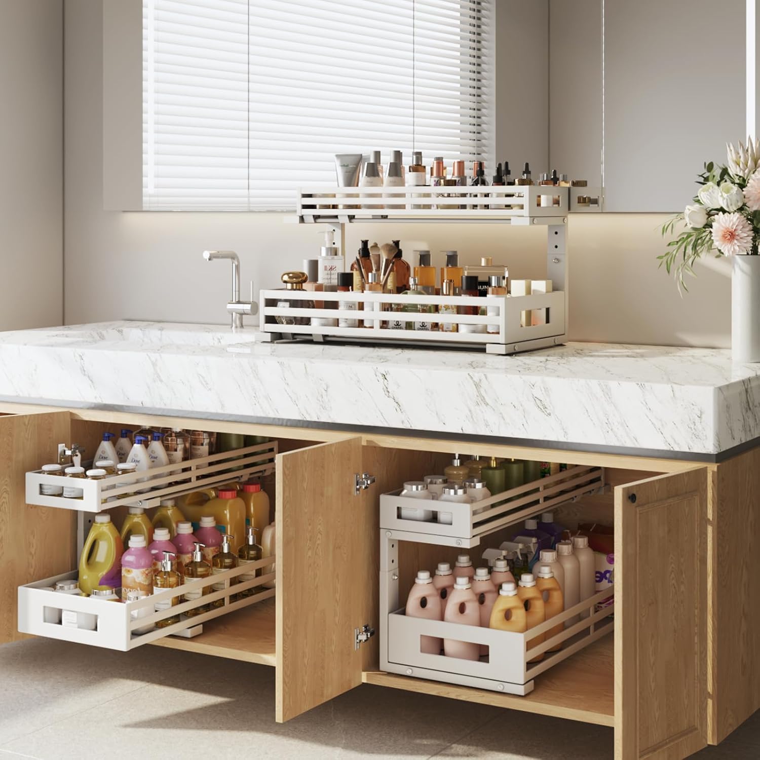 - 【Upgraded Anti-Tip Slide Rails】Built with durable round tube slide rails,Both upper and lower tiers slide out smoothly for easy access.No more digging around—quickly grab what you need from the front or back.Anti-tip locking system prevents tilting when fully loaded.