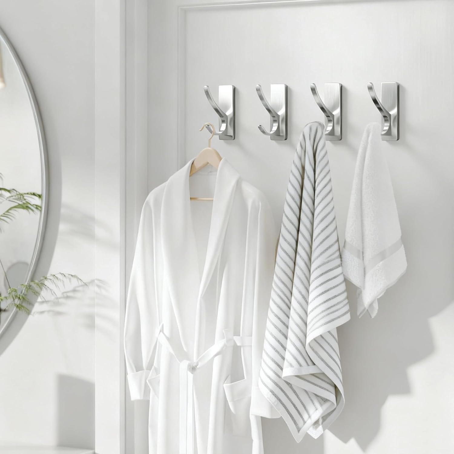 pickpiff Self Adhesive Coat Hooks for Hanging: Heavy Duty Stainless Wall Hook for Towel, Backpack, Hat, Sturdy Metal Hanger for Bathroom, Bedroom, Door, Brushed Nickel 4 Pack