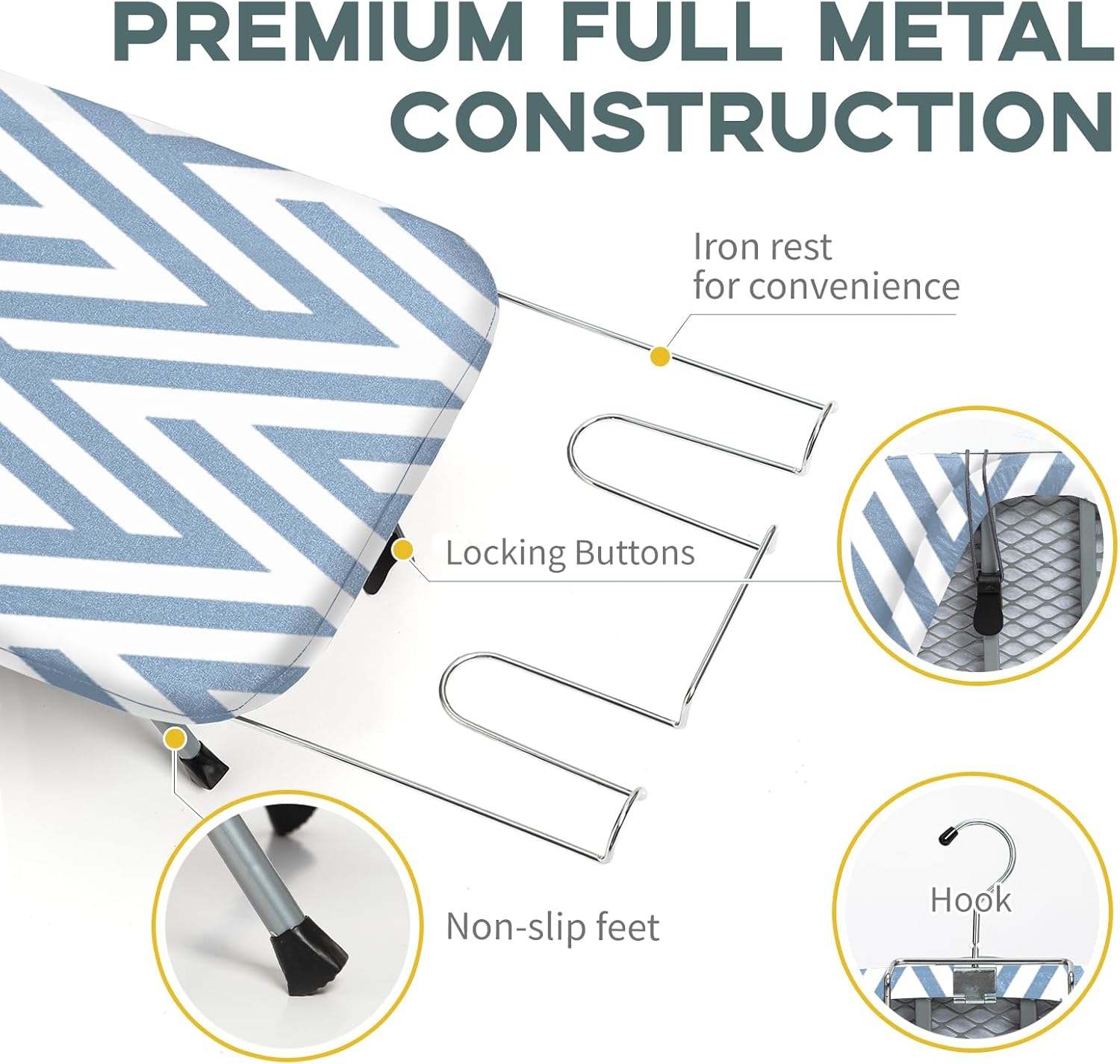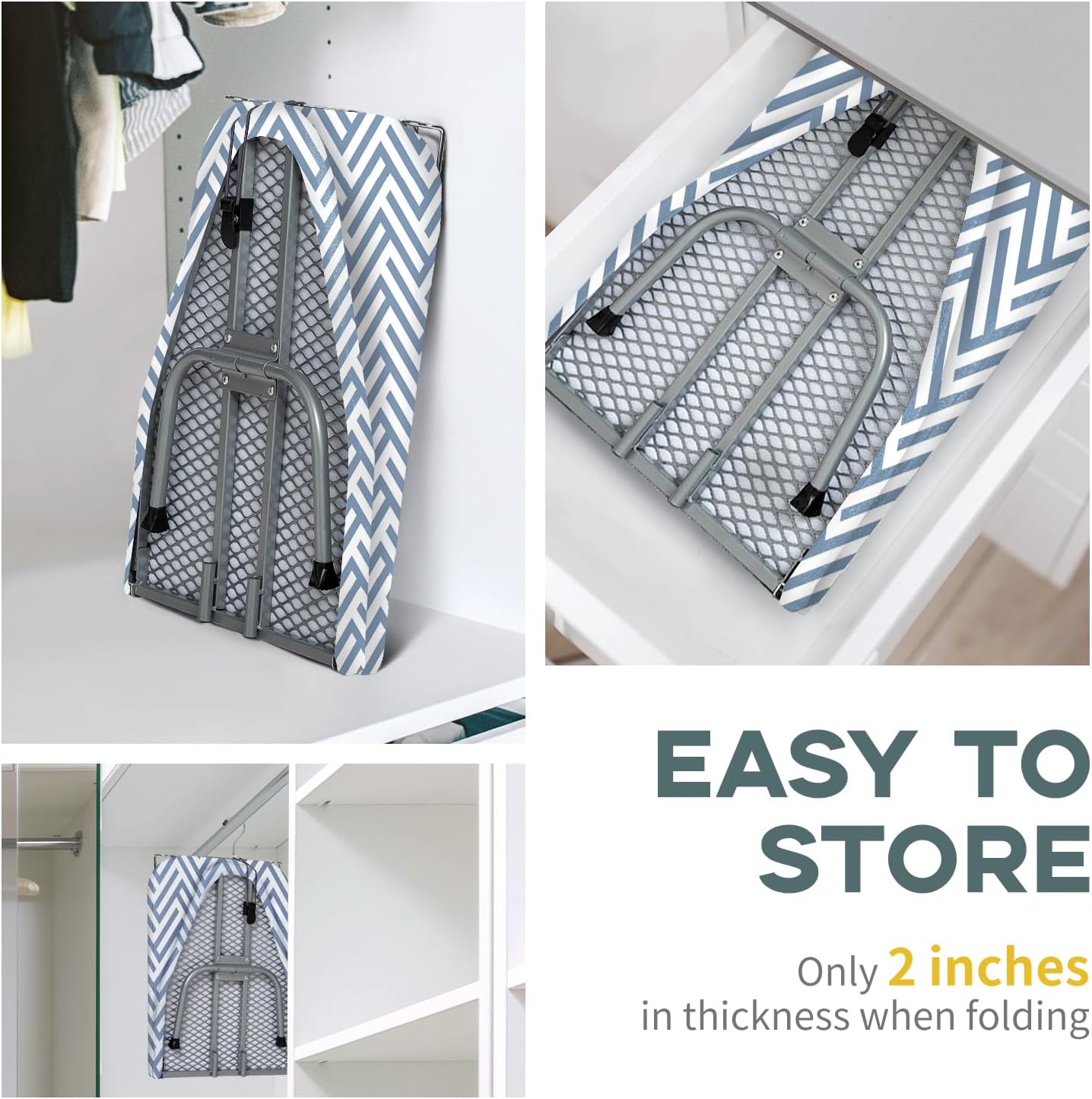 - Durable cover and padding: Equipped with a heat-resistant cover and 100% cotton pads; this compact ironing board ensures smooth, efficient ironing while protecting your clothes; the breathable mesh panel design promotes ventilation and quick heat dissipation