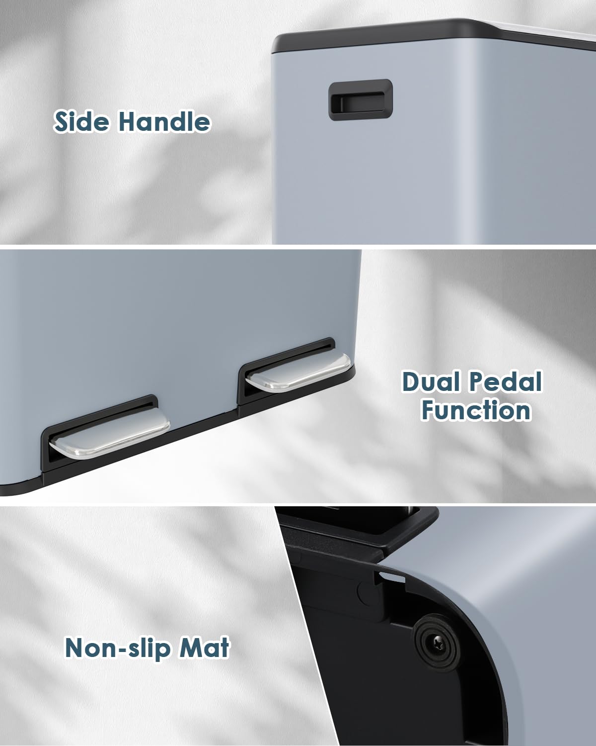 - Sealing Base&Soft Close: Recycling bin uses sealing base, which is effectively pet-proof and waterproof. And anti-slip rubber pads can prevent trash can from toppling over. Once your foot leaves the pedal,trash can lid will drop down automatically and quietly. Slow-closing lid design prevents sudden banging noises.