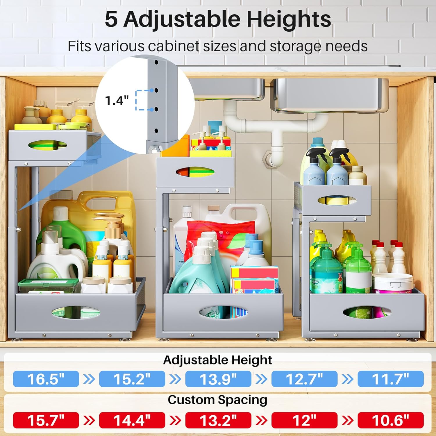 - Adjustable Heights for Custom Storage: With 5 levels of height adjustment (11.7"–16.5"), this kitchen sink organizer easily adapts to complex pipe setups, maximizing vertical space for items of various heights. The L-shaped design optimizes under-sink storage, with a narrow top and wide bottom layout that avoids pipes and garbage disposal.
